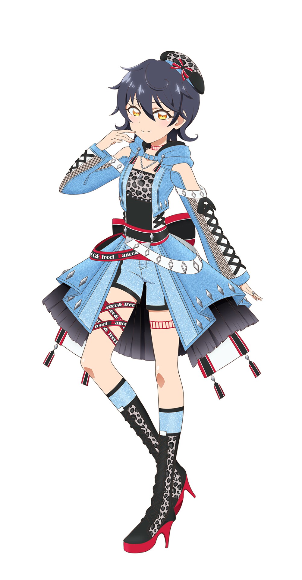 1girl animal_print belt beret black_boots black_hair black_hat black_shirt blue_jacket blue_shorts boots full_body hat high_heel_boots high_heels highres jacket kiratto_pri_chan knee_boots kurokawa_suzu leopard_print long_sleeves looking_at_viewer mini_hat official_art pretty_series second-party_source shirt short_hair shorts simple_background smile solo standing tachi-e thigh_strap white_background yellow_eyes