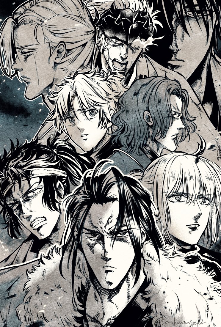 1girl 6+boys ahoge closed_eyes crying facial_scar fate/grand_order fate_(series) fur_shawl greyscale hara_tetsuo_(style) harada_sanosuke_(fate) headband hijikata_toshizou_(fate) japanese_clothes kimono kondou_isami_(fate) long_hair masaki_(star8moon) monochrome multiple_boys nagakura_shinpachi_(fate) okita_souji_(fate) open_mouth parody ponytail profile saitou_hajime_(fate) scar scar_on_cheek scar_on_face shawl shinsengumi_(fate) short_hair spot_color style_parody toudou_heisuke_(fate) wavy_hair yamanami_keisuke_(fate)