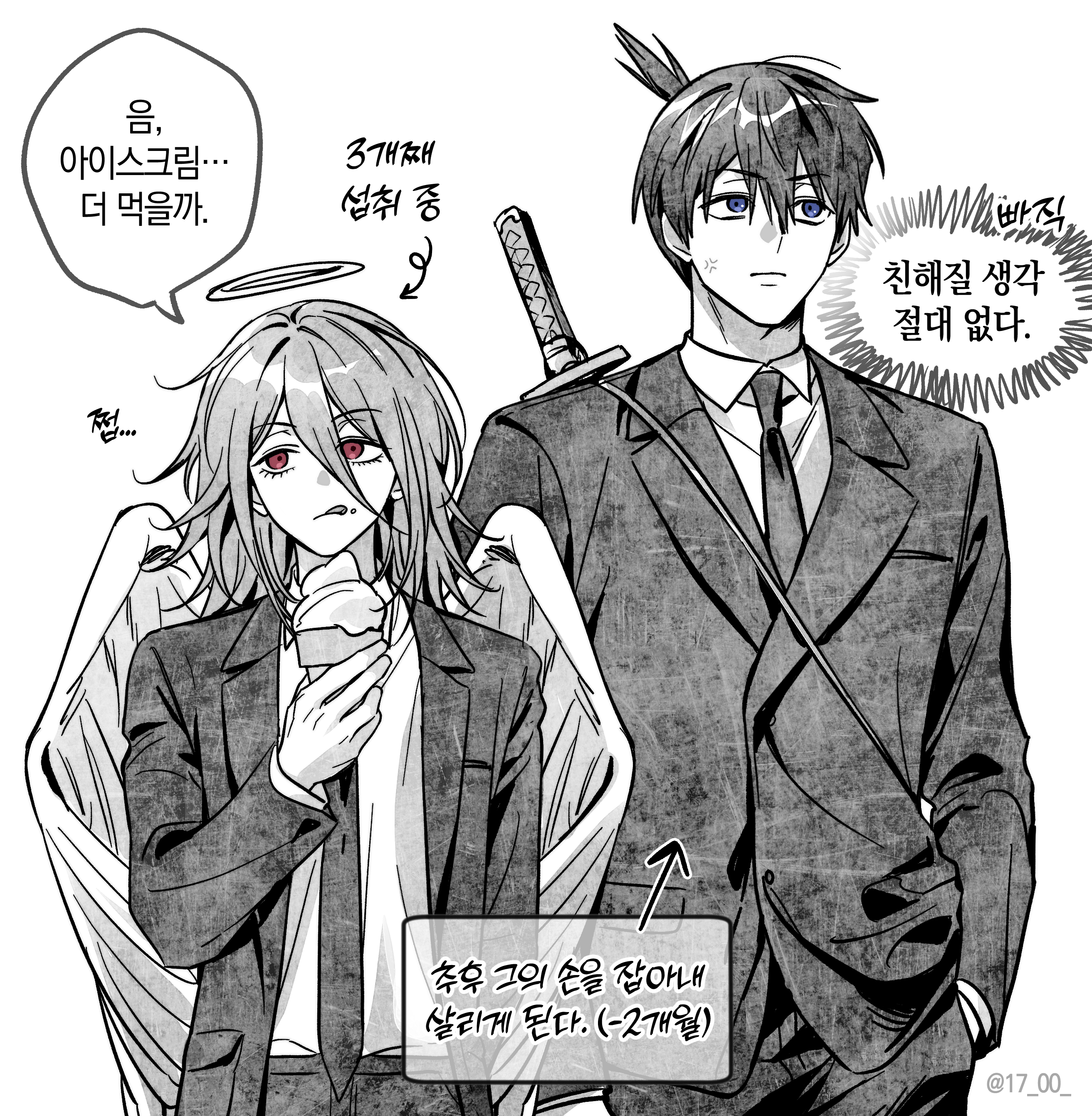 17_00 2boys absurdres angel angel_devil_(chainsaw_man) angel_wings black_jacket black_necktie black_suit business_suit chainsaw_man feathered_wings food formal_clothes glowing glowing_halo halo hayakawa_aki highres ice_cream jacket male_focus monochrome multiple_boys necktie shirt_tucked_in suit suit_jacket topknot traditional_halo wings