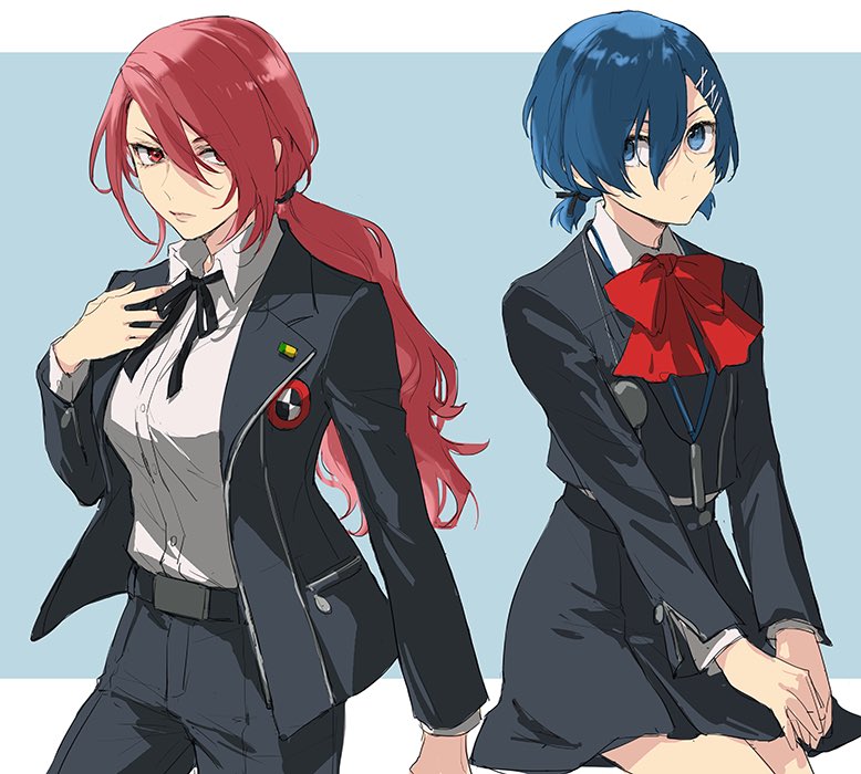 1boy 1girl arm_at_side belt black_belt black_jacket black_pants black_ribbon black_skirt blue_background blue_eyes blue_hair border bow closed_mouth commentary_request cosplay cowboy_shot crossdressing crossdressing_(ftm) crossdressing_(mtf) mp3_player digital_walkman dress_shirt gekkoukan_high_school_uniform hair_between_eyes hair_ornament hair_over_one_eye hairclip hand_on_own_chest isa_(peien516) jacket kirijou_mitsuru long_hair long_sleeves looking_at_viewer looking_up low_ponytail open_clothes open_jacket outside_border own_hands_together pants persona persona_3 ponytail red_bow red_eyes red_hair ribbon school_uniform shiomi_kotone shiomi_kotone_(cosplay) shirt short_hair short_twintails skirt twintails v_arms walkman_nw-s203f white_border white_shirt yuuki_makoto_(persona_3) yuuki_makoto_(persona_3)_(cosplay)
