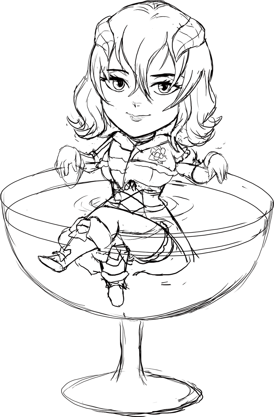 bloodstained_(series) cocktail_glass crossed_legs cup drinking_glass fake_horns hairband highres horn_hairband horns looking_at_viewer miriam_(bloodstained) short_hair sketch teevo