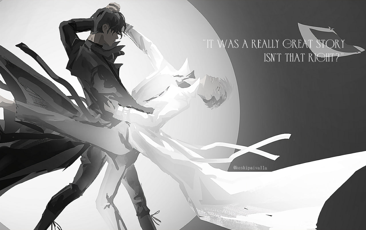 2boys black_coat black_hair closed_eyes coat color_contrast dancing english_text feet_out_of_frame hand_on_another's_waist holding_hands keskipaivalla kim_dokja moon multiple_boys omniscient_reader's_viewpoint open_clothes open_coat popped_collar white_coat white_hair wind wind_lift yoo_joonghyuk