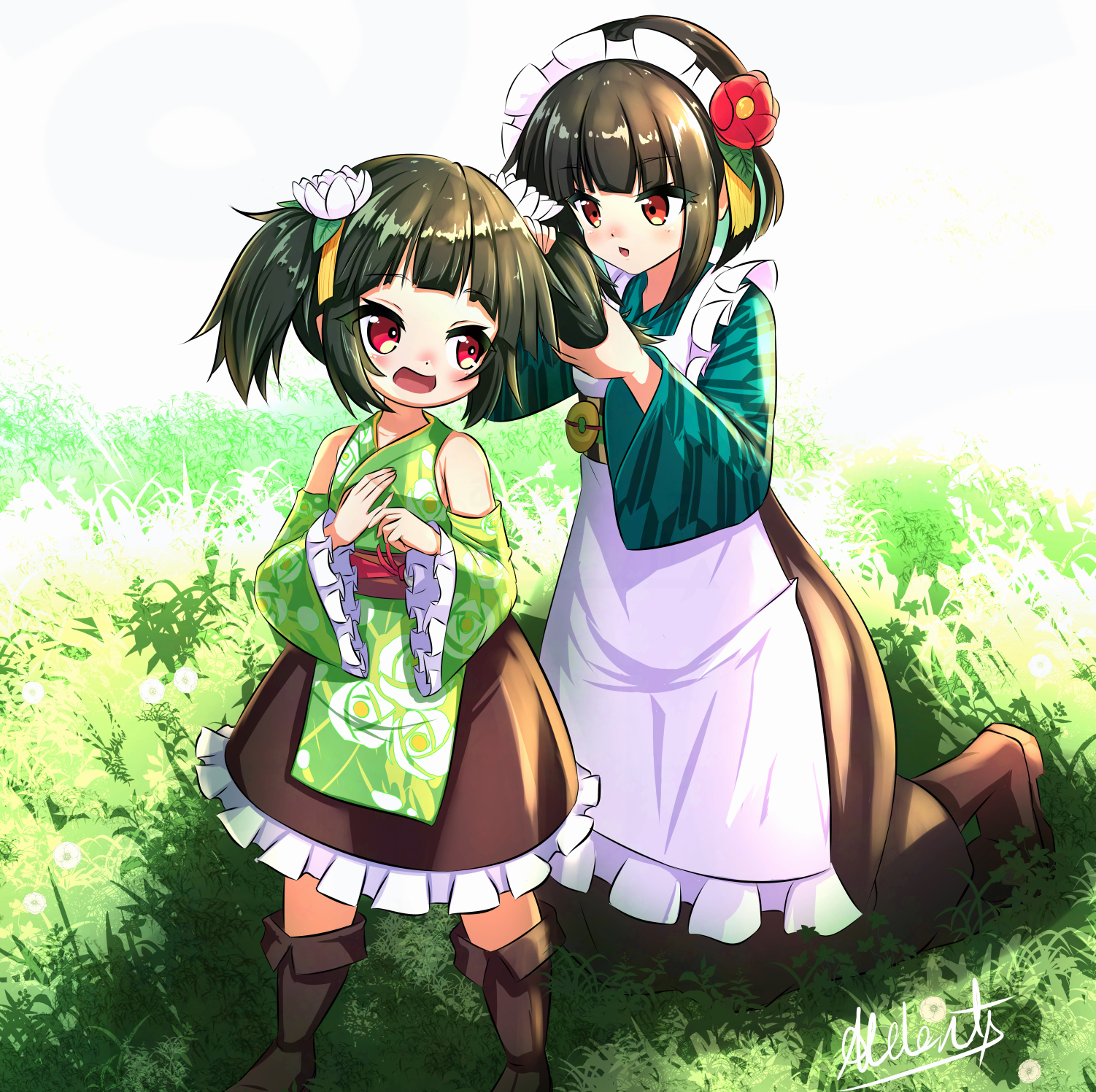 2girls aldent braiding_hair grass hairdressing highres iroha_(rune_factory) maid multiple_girls red_eyes rune_factory rune_factory:_guardians_of_azuma siblings signature sisters suzu_(rune_factory)