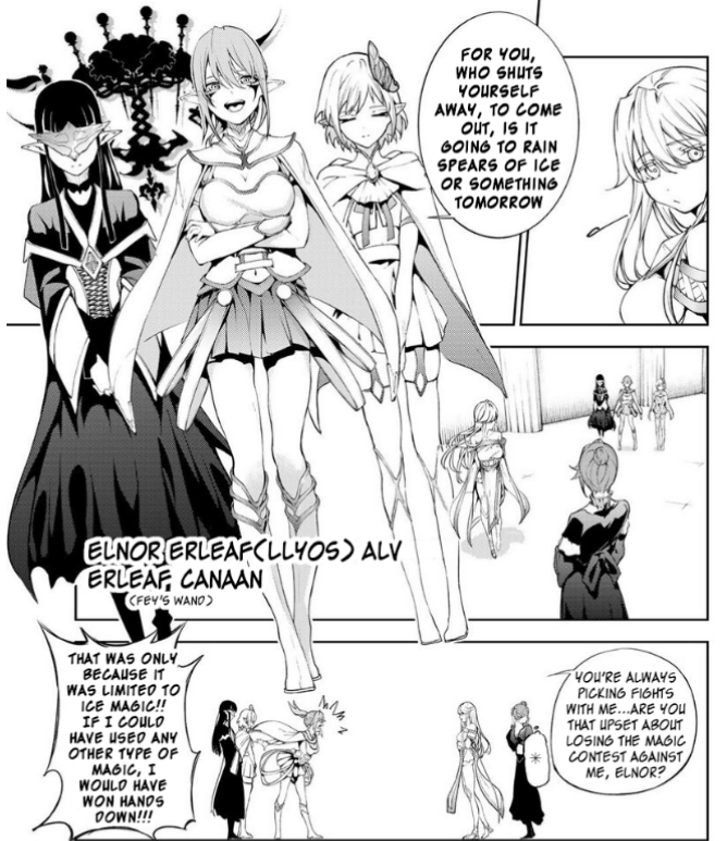 5girls aoi_toshi barefoot boots breasts cape capelet character_request closed_eyes closed_mouth cropped crossed_arms dot_nose dress elf elfaria_albis_serfort_(tsue_to_tsurugi_no_wistoria) ellenor_ljos_alf_(tsue_to_tsurugi_no_wistoria) english_text eye_mask female_focus filvis_challia_(tsue_to_tsurugi_no_wistoria) flat_chest full_body garter_belt garter_straps hair_bun hair_ornament kneehighs large_breasts lefiya_viridis_(tsue_to_tsurugi_no_wistoria) legs long_hair long_skirt long_sleeves manga_illustration manga_page mask medium_breasts medium_hair midriff miniskirt monochrome multiple_girls navel off-shoulder_dress off_shoulder official_art open_mouth pelvic_curtain pleated_skirt pointy_ears sexually_suggestive short_hair side_slit single_hair_bun skirt sleeveless sleeveless_dress small_breasts socks speech_bubble stomach teeth thighhighs thighs translated tsue_to_tsurugi_no_wistoria upper_teeth_only zettai_ryouiki
