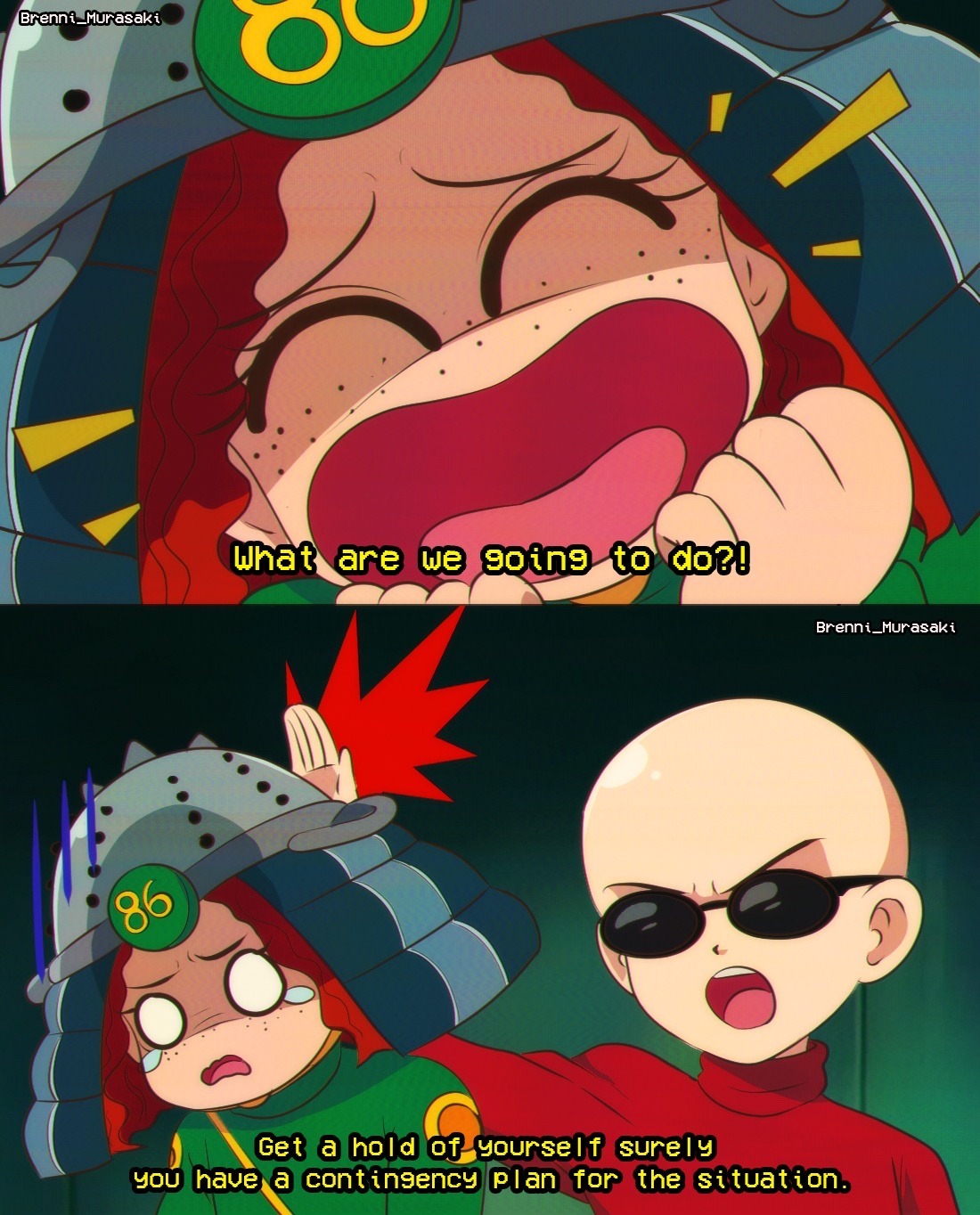 1990s_(style) 1boy 1girl bald blonde_hair brenni_murasaki clip_studio_paint_(medium) codename:_kids_next_door english_text freckles goggles_on_eyes highres looking_at_viewer numbuh_1 numbuh_86 open_mouth red_hair retro_artstyle scene_reference shirt sunglasses upper_body wavy_hair
