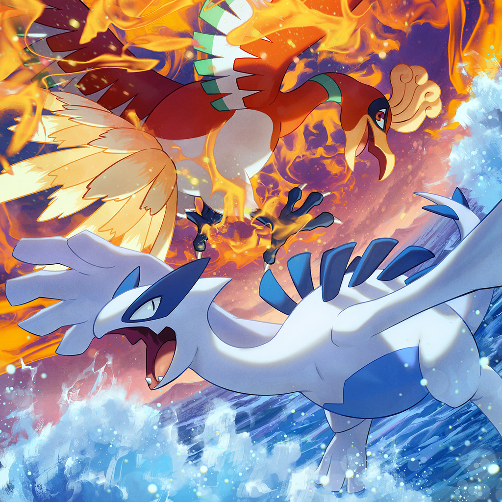 animal_focus artist_request bird cloud fangs fire gen_2_pokemon ho-oh legendary_pokemon lugia nintendo no_humans official_art open_mouth orange_eyes outdoors pokemon pokemon_(creature) pokemon_focus pokemon_tcg pokemon_tcg_pocket sky slit_pupils third-party_source water
