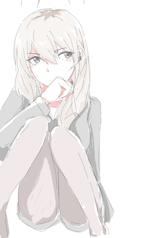 1girl black_pantyhose black_shirt girls_band_cry grey_eyes grey_hair hair_between_eyes hanekuri_(nnainain) kawaragi_momoka legs_up long_hair multicolored_hair pantyhose roots_(hair) shirt simple_background sitting solo white_background