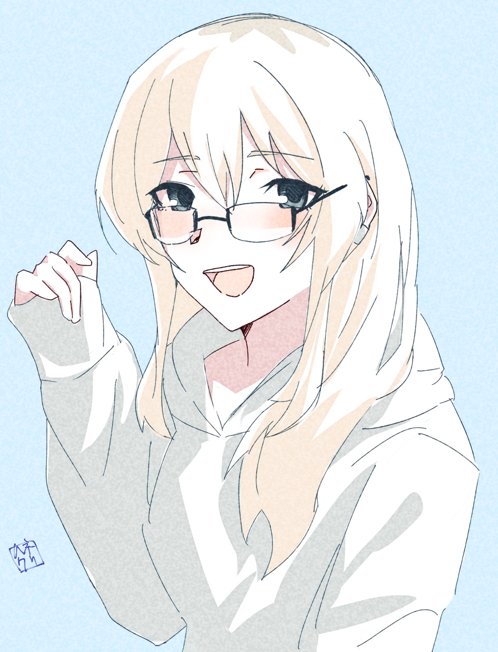 1girl blue_background girls_band_cry glasses grey_eyes grey_hair hair_between_eyes hanekuri_(nnainain) highres hood hood_down hoodie kawaragi_momoka long_hair looking_at_viewer multicolored_hair open_mouth roots_(hair) sleeves_past_wrists smile solo teeth upper_body upper_teeth_only white_hoodie