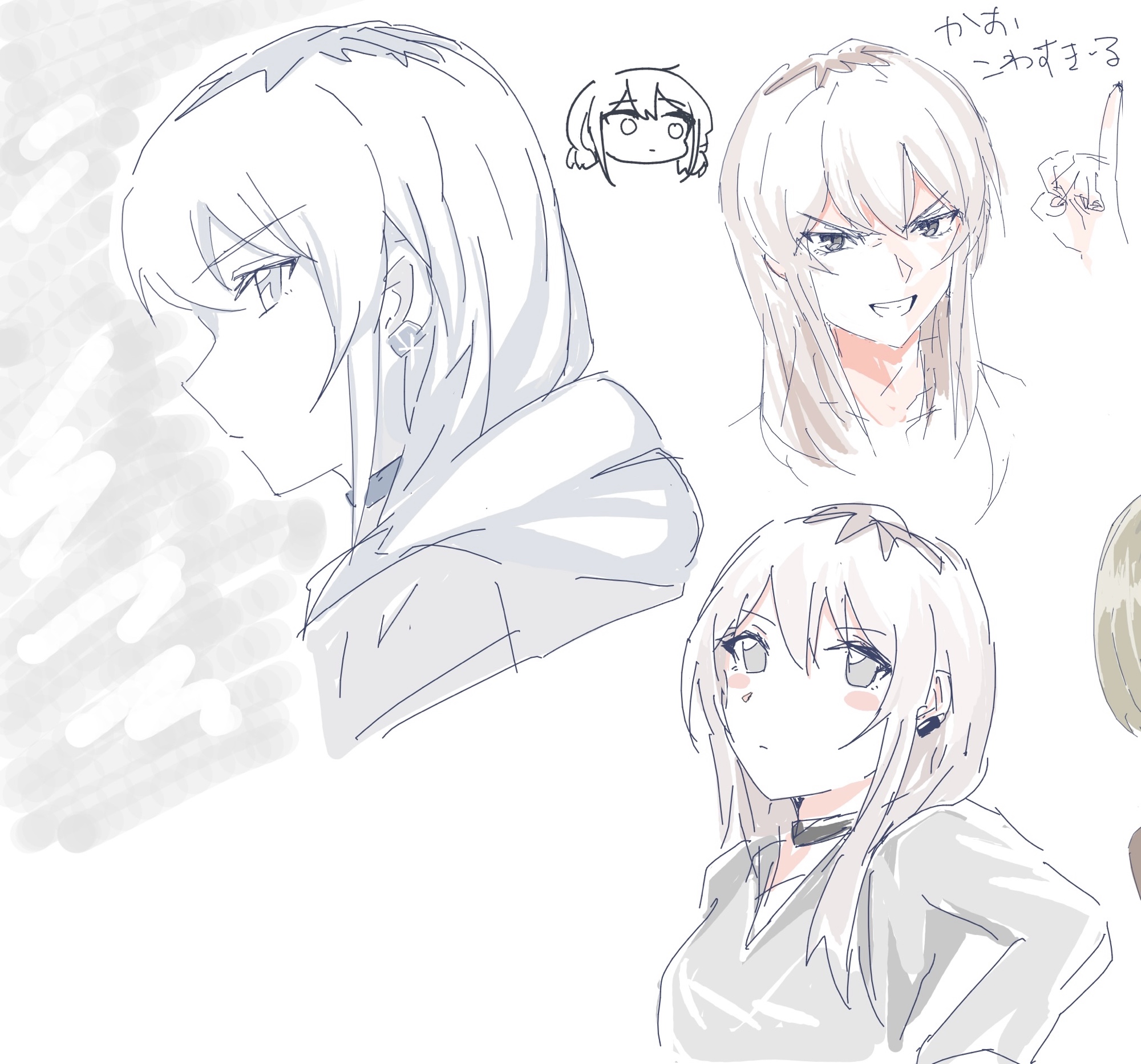2girls black_choker choker clenched_teeth closed_mouth commentary girls_band_cry glint grey_hair hanekuri_(nnainain) highres iseri_nina kawaragi_momoka long_hair multicolored_hair multiple_girls open_mouth partially_colored pinky_out roots_(hair) simple_background teeth translation_request white_background