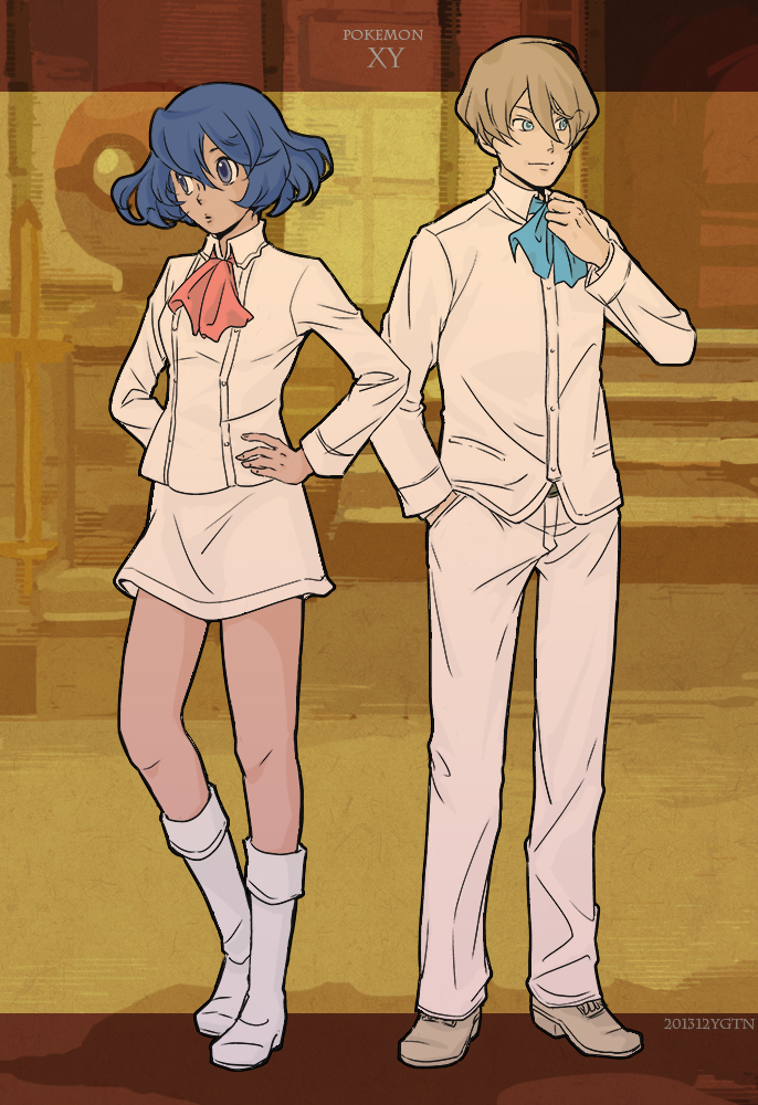 1boy 1girl ascot blonde_hair blue_ascot blue_eyes boots copyright_name dexio_(pokemon) full_body hand_in_pocket k_knuckle nintendo pokemon pokemon_x_and_y red_ascot shoes sina_(pokemon) standing white_shoes