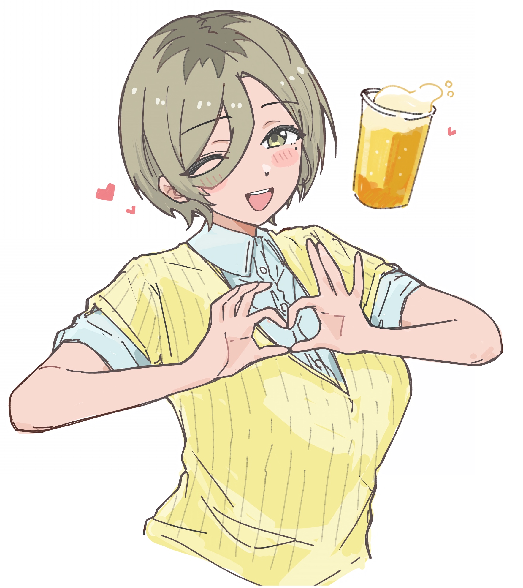 1girl alcohol beer blue_shirt blush brown_eyes brown_hair collared_shirt commentary cup dress_shirt girls_band_cry hair_between_eyes hanekuri_(nnainain) heart heart_hands highres long_hair_between_eyes mole mole_under_eye multicolored_hair one_eye_closed open_mouth roots_(hair) rupa_(girls_band_cry) shirt simple_background solo sweater untranslatable_commentary teeth upper_body upper_teeth_only white_background yellow_sweater