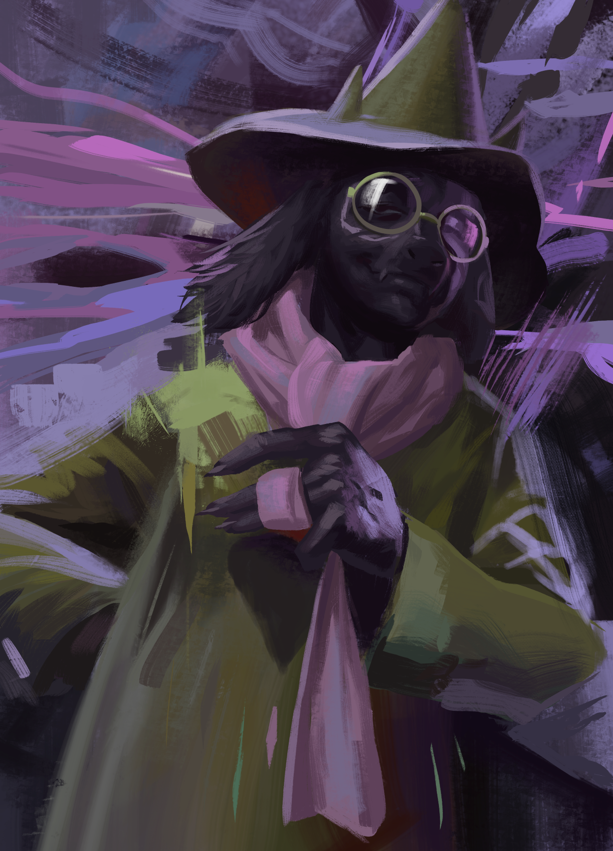 1boy angusburgers black_fur deltarune disco_elysium glasses goat_boy hat highres male_focus purple_scarf ralsei ralsei_(hat) round_eyewear scarf solo upper_body utdr_(toby_fox) wizard wizard_hat