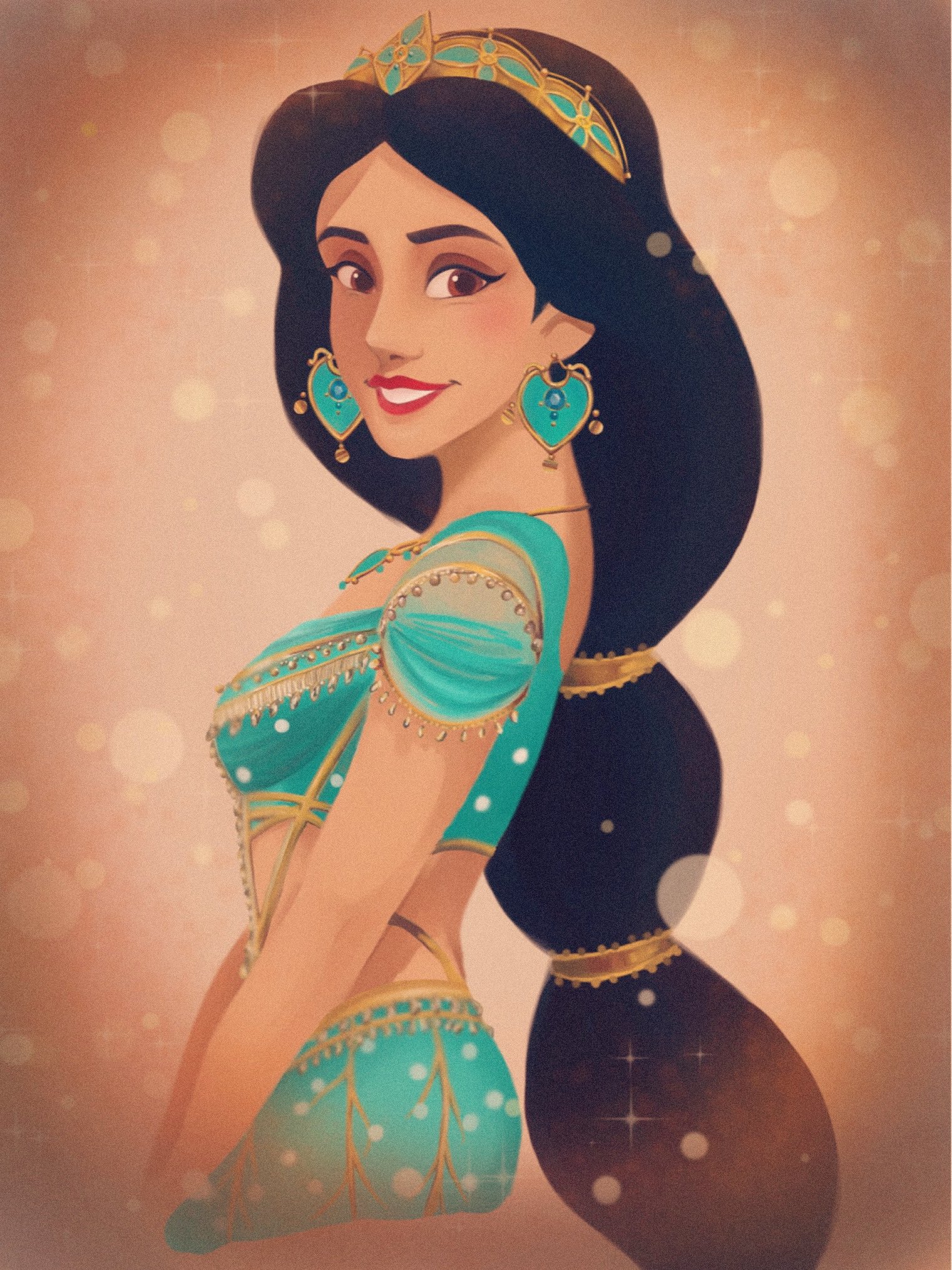 1girl aladdin_(movie) arabian_clothes bare_shoulders black_hair breasts brown_eyes brown_hair dark-skinned_female dark_skin earrings highres jasmine_(disney) jewelry long_hair looking_at_viewer navel necklace off_shoulder ri_ri_ri2 shirt smile solo very_long_hair