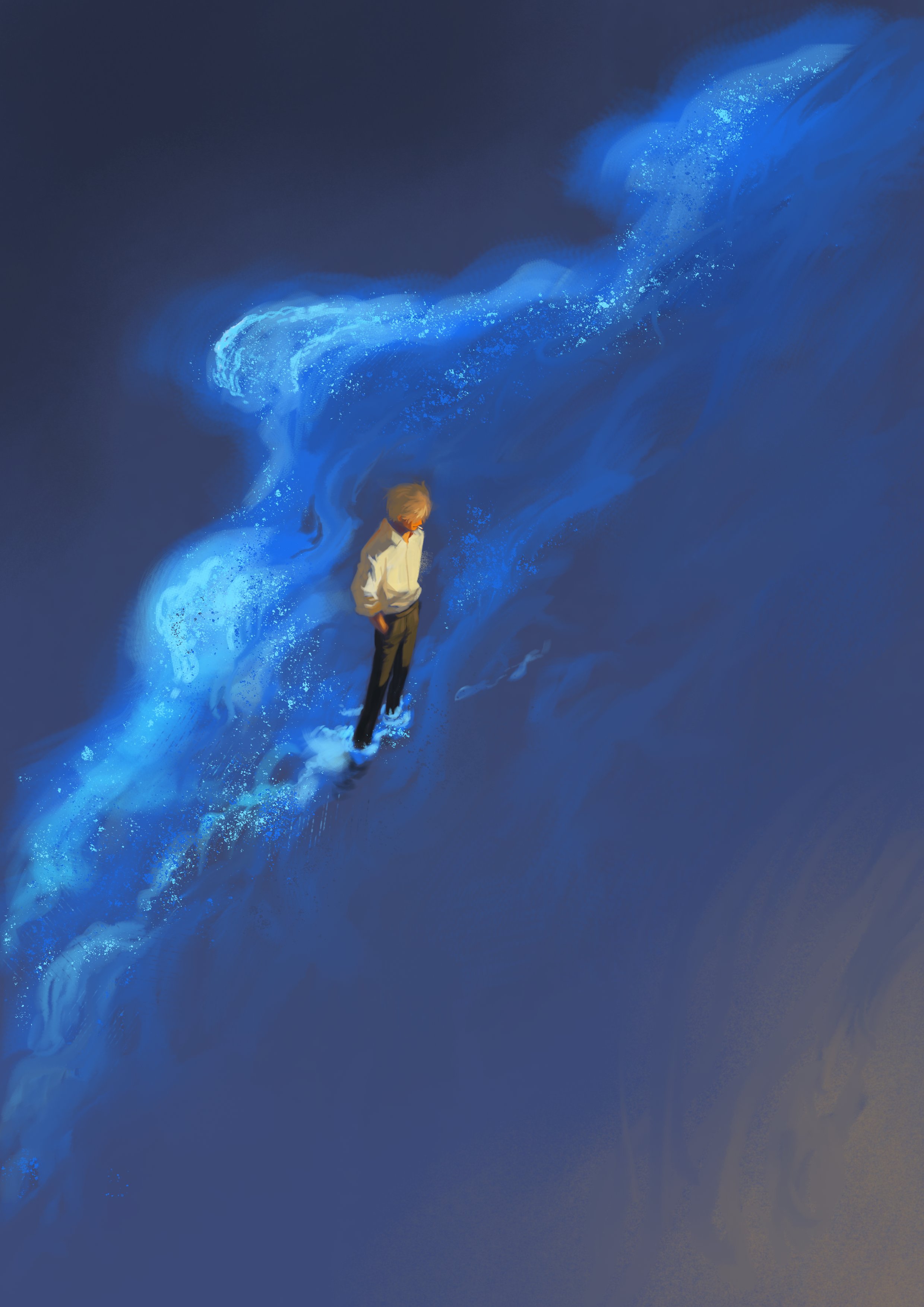 1boy absurdres black_pants blonde_hair cigarette commentary from_above full_body hands_in_pockets highres jennyandloiryan male_focus ocean one_piece pants sanji_(one_piece) shirt short_hair smoking untranslatable_commentary wading white_shirt wide_shot
