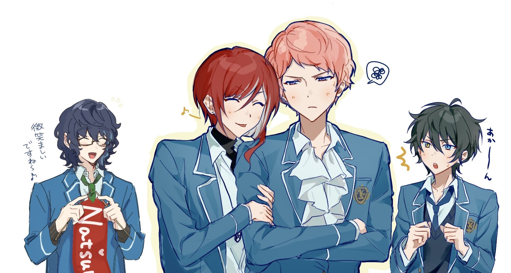 4boys aoba_tsugumi ascot black_hair blazer blue_eyes blue_jacket blue_necktie character_name clenched_hands closed_mouth collared_shirt commentary_request ensemble_stars! glasses green_necktie hair_between_eyes hands_up heterochromia highres holding index_finger_raised itsuki_shu jacket jewelry kagehira_mika lapels long_sleeves male_focus medium_hair multiple_boys musical_note necklace necktie notched_lapels open_clothes open_jacket open_mouth pink_hair purple_eyes sakasaki_natsume school_uniform shirt short_bangs short_hair simple_background so_this_is_xx translation_request turtleneck upper_body white_background yellow_eyes yumenosaki_school_uniform