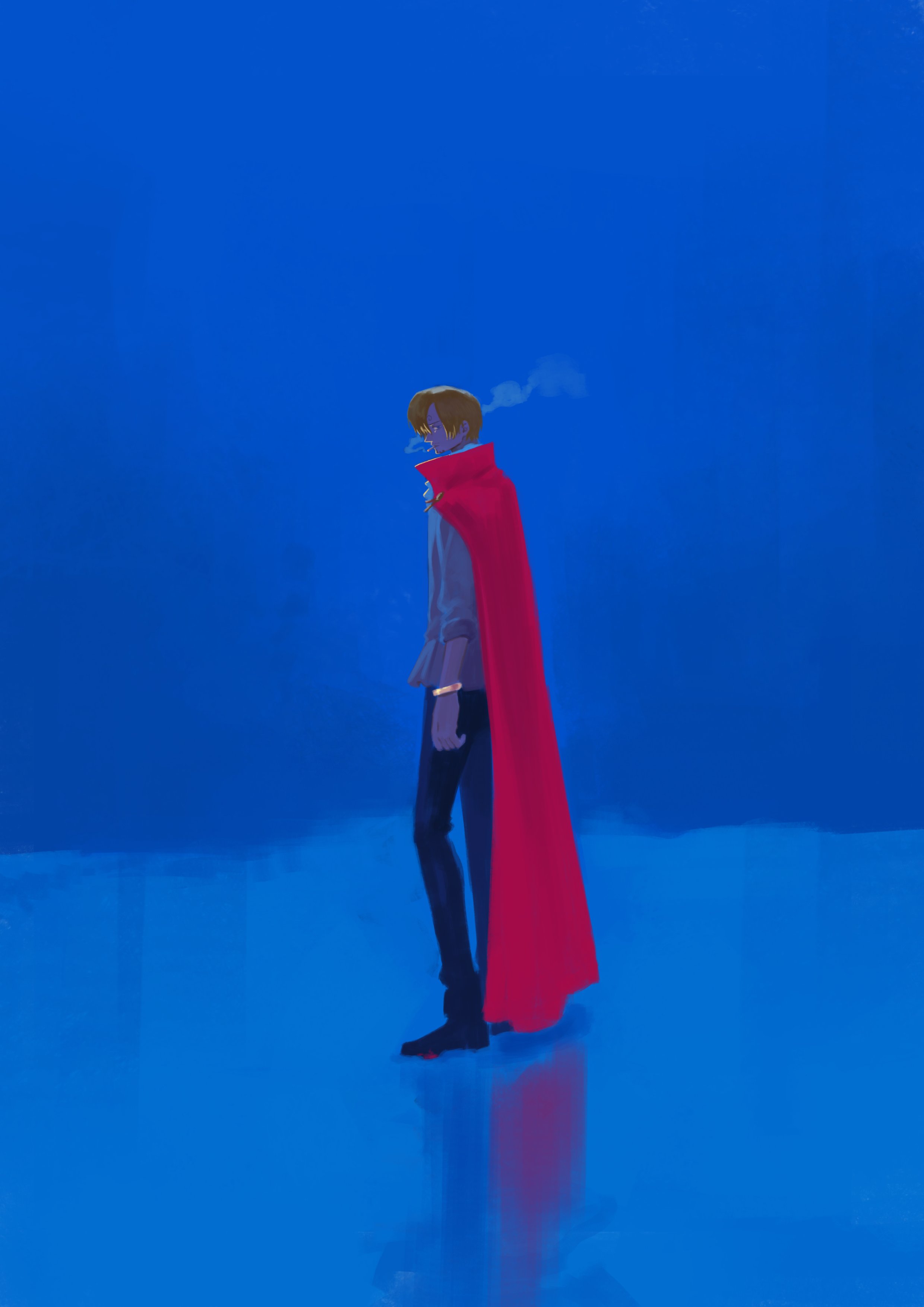 1boy absurdres black_pants blood_on_shoes blue_background bracelet cape cigarette commentary curly_eyebrows english_commentary full_body highres jennyandloiryan jewelry long_sleeves looking_at_viewer male_focus one_piece pants red_cape reflective_floor sanji_(one_piece) short_hair smoke smoke_trail smoking solo standing wide_shot