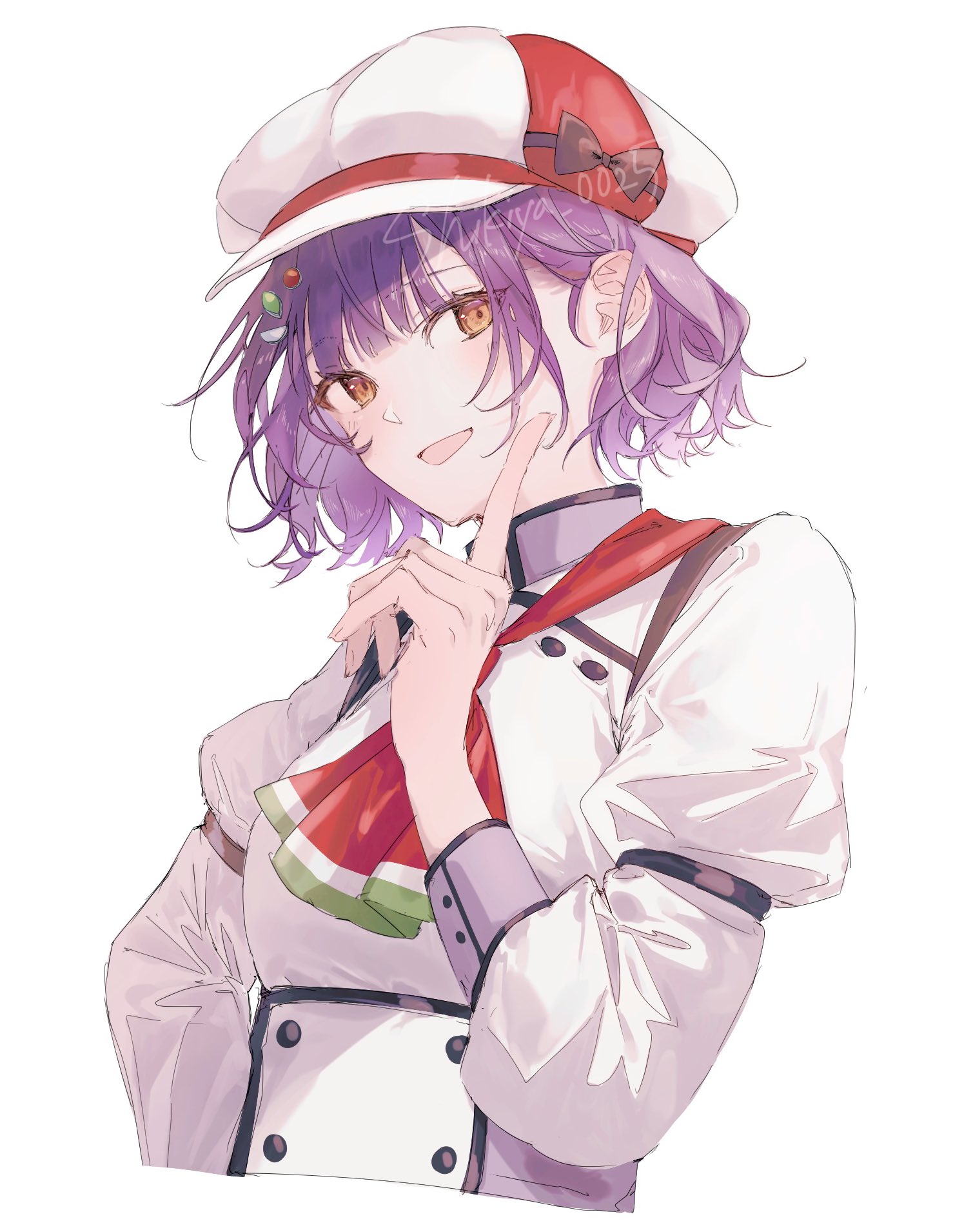 1girl ascot chef hair_ornament hairclip hat highres index_finger_raised long_sleeves looking_at_viewer nanase_suzuna nijisanji official_alternate_costume open_mouth purple_hair red_ascot shikiya_0025 short_hair simple_background smile solo upper_body virtual_youtuber white_background yellow_eyes