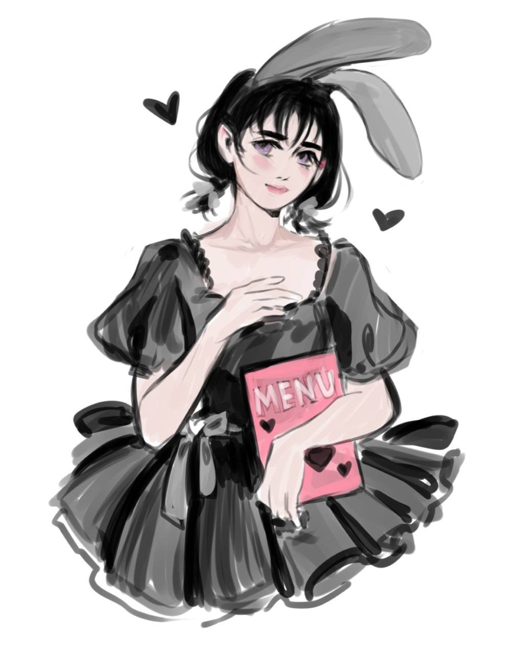 1girl alien_stage animal_ears black_dress black_hair bymerime commentary dress fake_animal_ears heart highres holding holding_menu low_twintails menu official_alternate_costume puffy_short_sleeves puffy_sleeves purple_eyes rabbit_ears short_sleeves solo sua_(alien_stage) untranslatable_commentary twintails