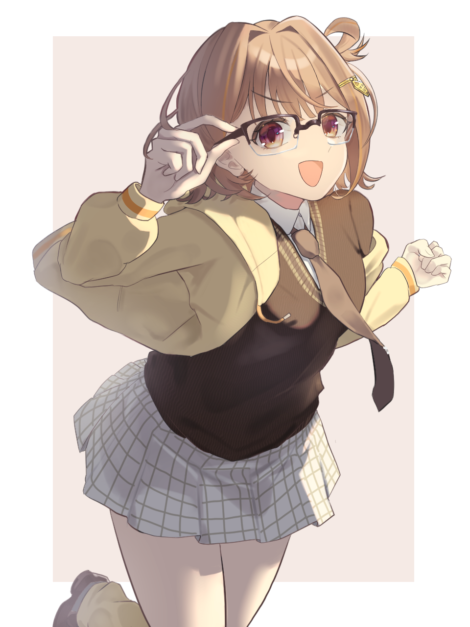 1girl :d adjusting_eyewear border brown_background brown_eyes brown_hair brown_necktie brown_shoes brown_sweater clenched_hand collared_shirt colored_skin commentary_request dress glasses grey_skin hair_ornament hair_rings hands_up highres hood hood_down hooded_jacket jacket leg_up long_sleeves looking_at_viewer loose_socks medium_hair miniskirt necktie open_clothes open_jacket open_mouth over-rim_eyewear partial_commentary plaid_clothes plaid_skirt pleated_dress rectangular_eyewear semi-rimless_eyewear sendo_yuuhi sendo_yuuhi_(1st_costume) shirt shoes simple_background single_hair_ring skirt smile socks solo sweater thighs v-shaped_eyebrows virtual_youtuber vspo! white_border white_shirt y3_(user_heyx5852) yellow_jacket yellow_socks