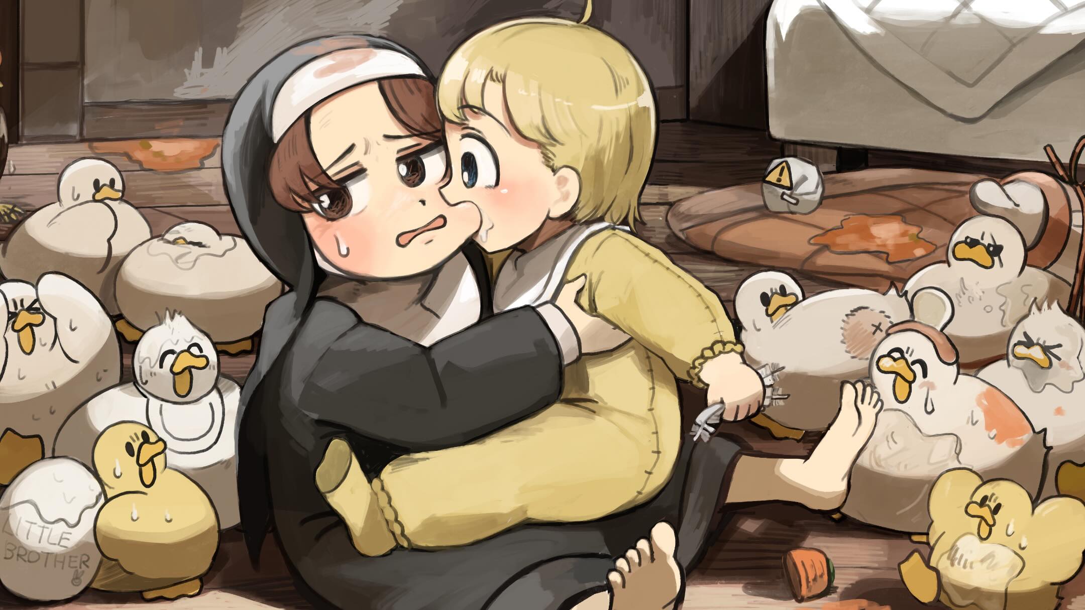 2girls aged_down baby_animal barefoot bib bird biting biting_cheek blonde_hair blue_eyes brown_eyes brown_hair chicken clumsy_nun_(diva) commentary diva_(hyxpk) duck duckling egg english_commentary highres hungry_nun_(diva) little_nuns_(diva) multiple_girls nun socks traditional_nun yellow_socks