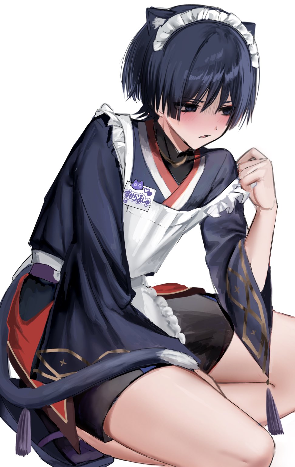 1boy alternate_costume animal_ears apron black_eyes black_hair black_kimono black_sandals black_shorts black_socks blush cat_boy cat_ears cat_tail clenched_hand crossdressing crossdressing_(mtf) embarrassed empty_eyes enmaided frilled_apron frills full_body genshin_impact gold gold_trim hand_up highres japanese_clothes jewelry juban kimono long_sleeves looking_to_the_side maid maid_apron male_focus male_maid mandarin_collar neck_ring open_mouth purple_sash red_kimono sandals sash scaramouche_(cat)_(genshin_impact) scaramouche_(genshin_impact) shorts single_off_shoulder socks solo squatting tabi tail tassel wa_maid white_apron white_background white_kimono wide_sleeves wispy_bangs yu_(geda4335) zouri