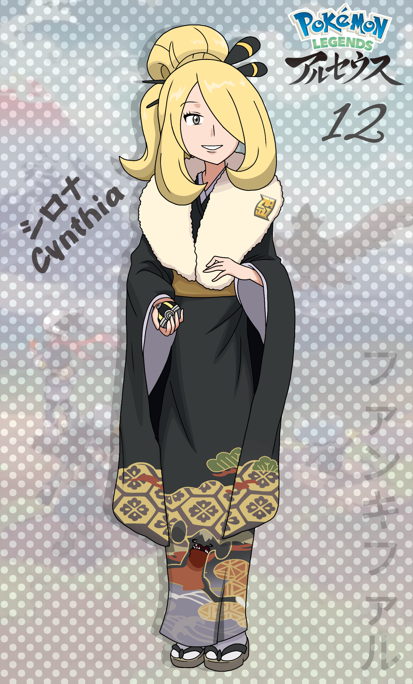 1girl alternate_costume alternate_hairstyle black_kimono blonde_hair breasts character_name cynthia_(pokemon) eyelashes fankifalu female_focus full_body fur-trimmed_kimono fur_trim furisode gen_4_pokemon geta grey_eyes hair_bobbles hair_ornament hair_over_one_eye hair_stick hands_up happy highres hisuian_poke_ball holding holding_poke_ball japanese_clothes japanese_text kimono long_hair long_sleeves looking_at_viewer medium_breasts neck nintendo obi parted_lips poke_ball pokemon pokemon_champion pokemon_diamond/pearl/platinum pokemon_legends:_arceus print_kimono sandals sash sidelocks smile socks standing tabi very_long_hair white_socks wide_hips wide_sleeves