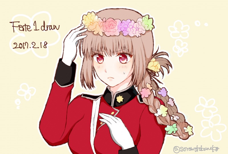 1girl braid braided_hair_rings breasts brown_hair closed_mouth dated fate/grand_order fate_(series) florence_nightingale_(fate) flower flower_wreath hair_flower hair_ornament hair_rings light_blush medium_breasts medium_hair pink_eyes srnk sweatdrop traffic_light upper_body