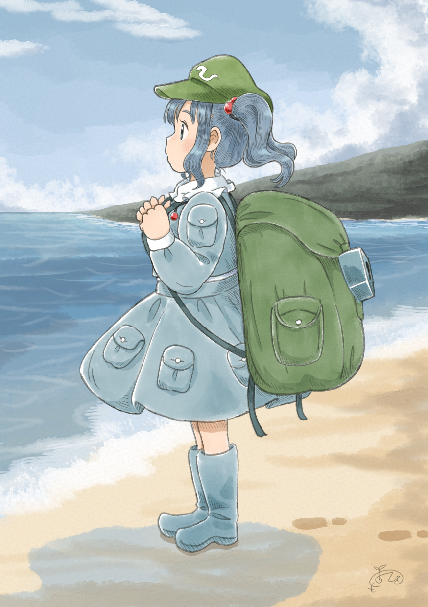 1girl backpack bag blue_boots blue_eyes blue_hair blue_sky boots chii-kun_(seedyoulater) cloud cloudy_sky commentary_request day from_side full_body green_hat hair_bobbles hair_ornament hat highres horizon kawashiro_nitori knee_boots long_sleeves outdoors pocket profile revision rubber_boots short_hair signature skirt skirt_set sky solo touhou two_side_up water