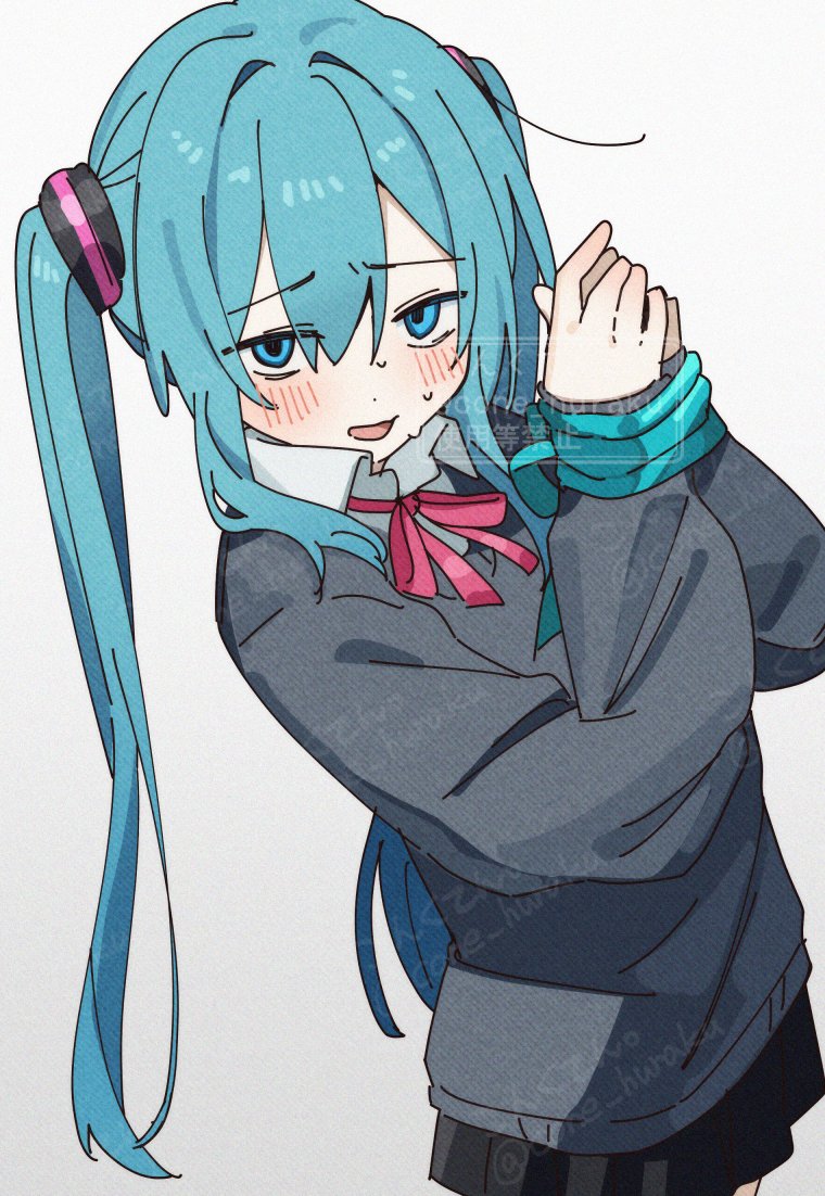 1girl black_skirt blue_eyes blue_hair blue_ribbon blush bound bound_wrists commentary_request corn_kuten cowboy_shot double-parted_bangs grey_sweater hair_between_eyes hatsune_miku long_hair looking_at_viewer neck_ribbon open_mouth pink_ribbon pleated_skirt ribbon school_uniform simple_background skirt solo sweater twintails vocaloid watermark white_background wing_collar