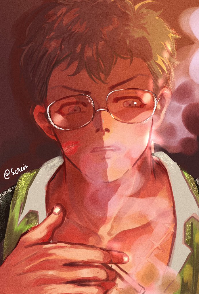 1boy cigarette commentary green_hair green_jacket holding holding_cigarette jacket lipstick_mark male_focus one_piece roronoa_zoro serein shadow short_hair smoke solo stitched_torso stitches sunglasses untranslatable_commentary twitter_username