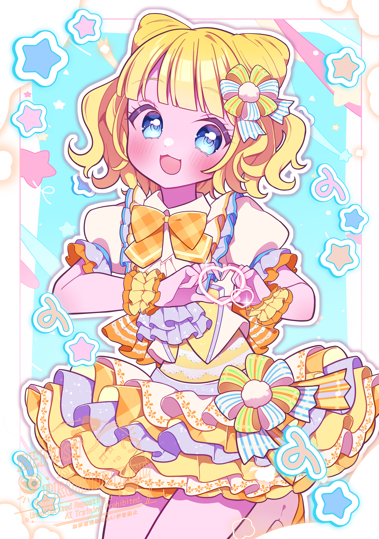 1girl blonde_hair blue_eyes blunt_bangs cone_hair_bun cowboy_shot double_bun dress hair_bun heart heart_hands highres looking_at_viewer minami_mirei open_mouth pretty_series pripara scrunchie solo star_(symbol) umecha_0 wavy_hair wrist_scrunchie