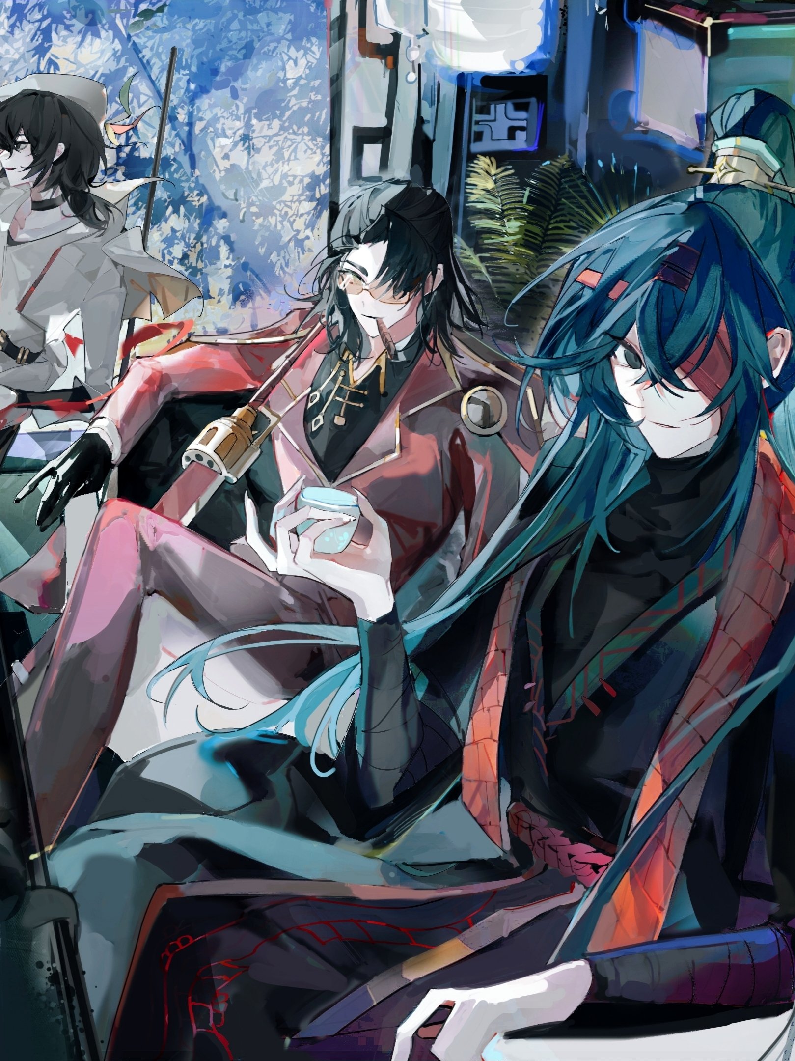 3boys black_eyes black_gloves black_hair black_hanfu black_shirt blue_hair chinese_clothes cigar collar costume_request crossed_bangs curtained_hair double-parted_bangs elbow_rest evelynyi21085 hongyuan_(identity)_(project_moon) fern gloves gold_trim hair_between_eyes hair_flowing_over hair_ornament hair_over_one_eye hanfu hat highres holding hong_lu_(project_moon) jacket jacket_on_shoulders knee_up limbus_company long_hair looking_at_viewer male_focus meursault_(project_moon) multiple_boys official_alternate_costume outdoors popped_collar project_moon red_jacket rope_belt scarf shirt sitting smirk sword thumb_(identity)_(project_moon) tinted_eyewear tree very_long_hair weapon white_shirt yellow-tinted_eyewear yi_sang_(project_moon)
