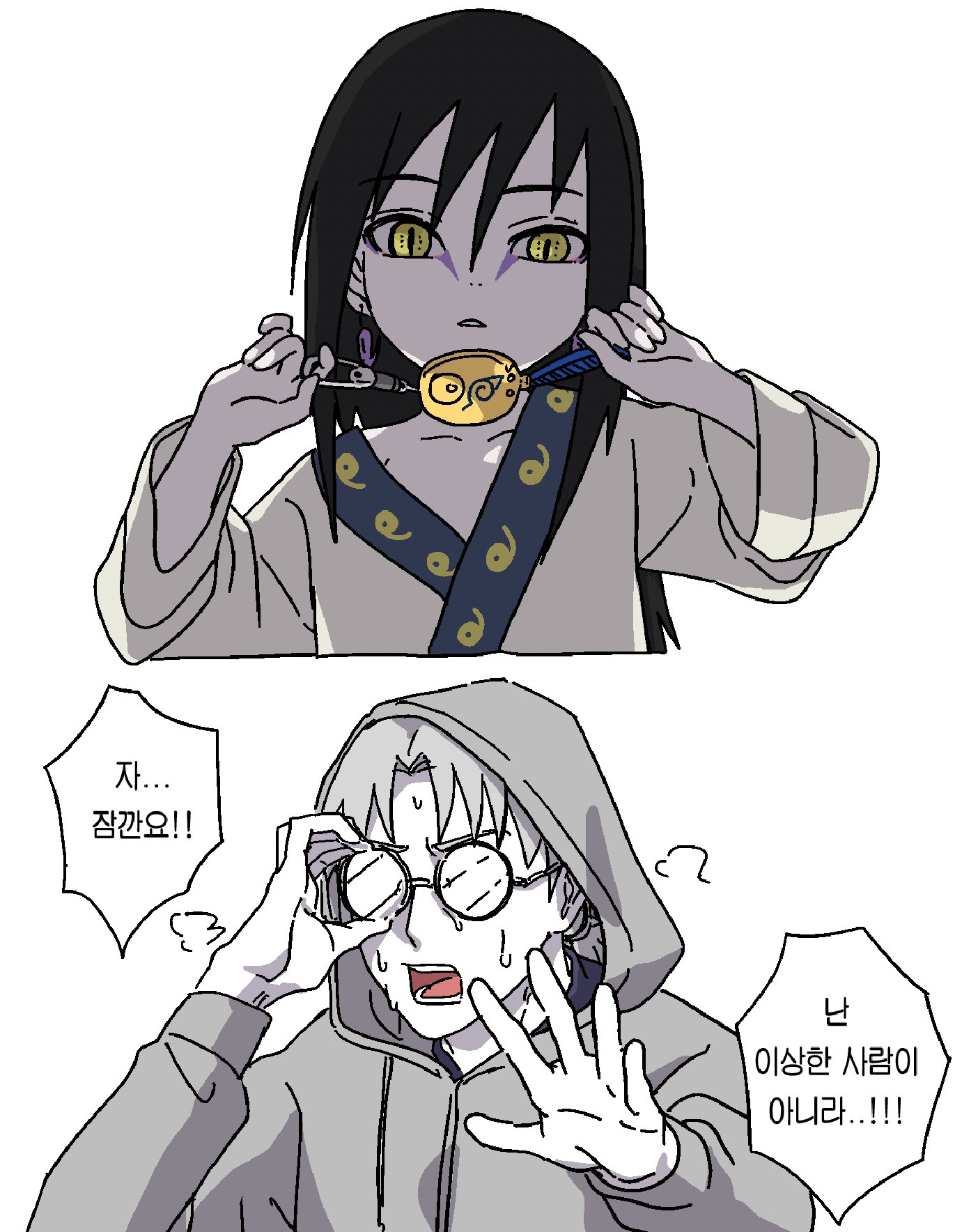 2boys :o aged_down black_hair crime_prevention_buzzer crime_prevention_buzzer_threat dot_nose eyeliner grey_hair grey_hoodie gyogyo_hjj hands_on_own_face highres holding hood hoodie japanese_clothes kimono korean_text long_hair makeup multiple_boys naruto_(series) naruto_shippuuden nervous_sweating orochimaru_(naruto) oversized_clothes pale_skin partially_translated round_eyewear shukusei!!_loli-kami_requiem slit_pupils speech_bubble sweat sweatdrop time_paradox translation_request yakushi_kabuto
