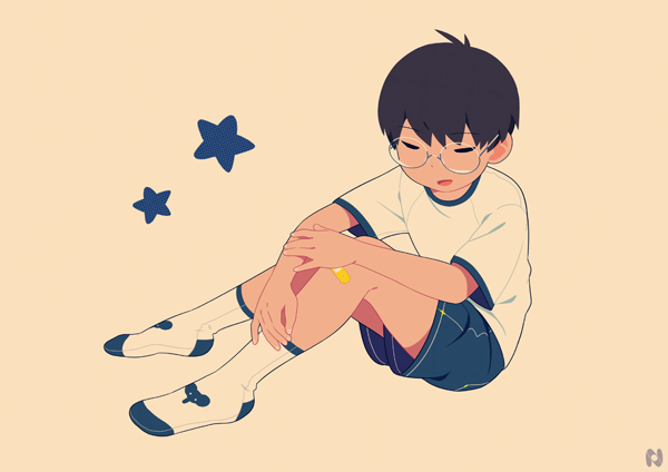 1boy bandaid bandaid_on_leg black_hair child glasses male_focus no_shoes noeyebrow_(mauve) open_mouth original shirt short_hair shorts simple_background sitting socks solo star_(symbol) t-shirt