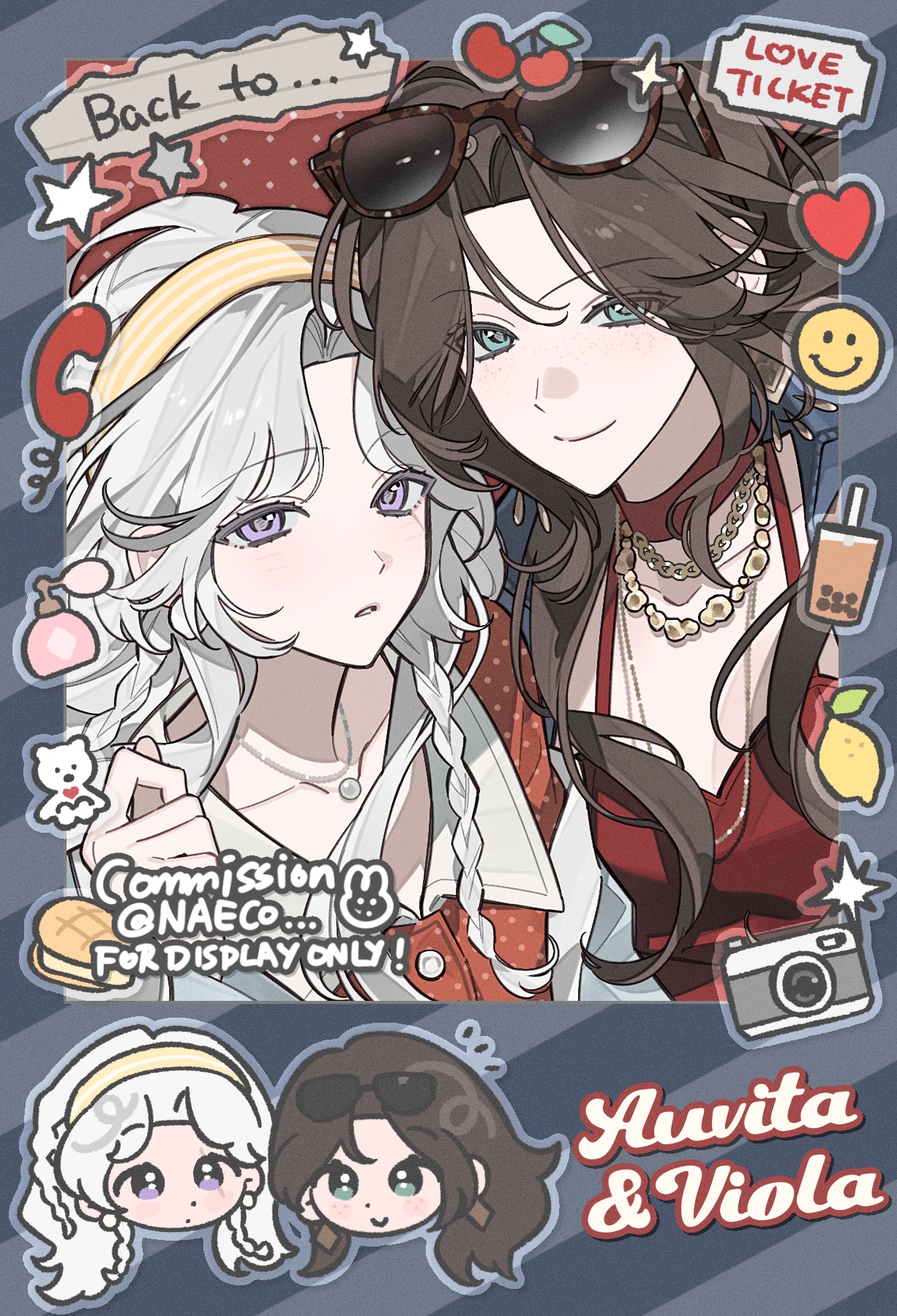 2girls braid breasts brown_hair camera chibi chibi_inset choker cleavage dress earrings emoji english_text evodtonaeco eyewear_on_head food fruit green_eyes hairband heart highres jacket jewelry long_hair looking_at_viewer multiple_girls necklace original parted_bangs purple_eyes red_dress shirt smile star_(symbol) striped_background sunglasses white_hair