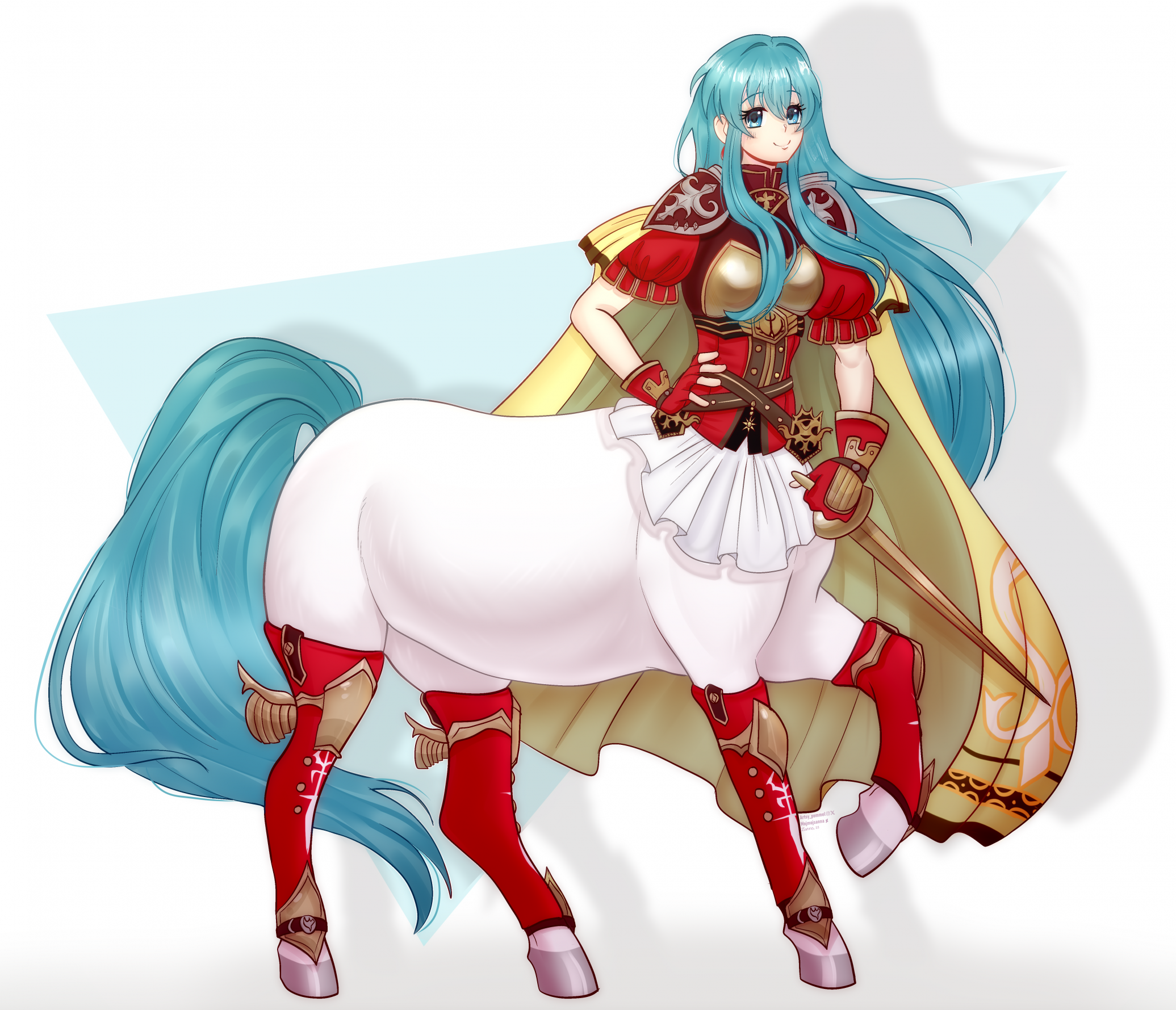 1girl aqua_eyes aqua_hair armor artsy_pommel breastplate breasts cape centaur closed_mouth commentary commission drop_shadow earrings eirika_(fire_emblem) english_commentary fingerless_gloves fire_emblem fire_emblem:_the_sacred_stones full_body gloves hair_between_eyes hand_on_own_hip highres holding holding_sword holding_weapon hooves horse_tail jewelry knee_pads leg_warmers long_hair looking_at_viewer medium_breasts monster_girl monsterification multiple_legs nintendo pauldrons rapier red_gloves red_leg_warmers red_shirt shadow shirt short_sleeves shoulder_armor sidelocks skirt smile solo standing standing_on_three_legs sword tail taur very_long_hair very_long_tail weapon white_background white_skirt yellow_cape