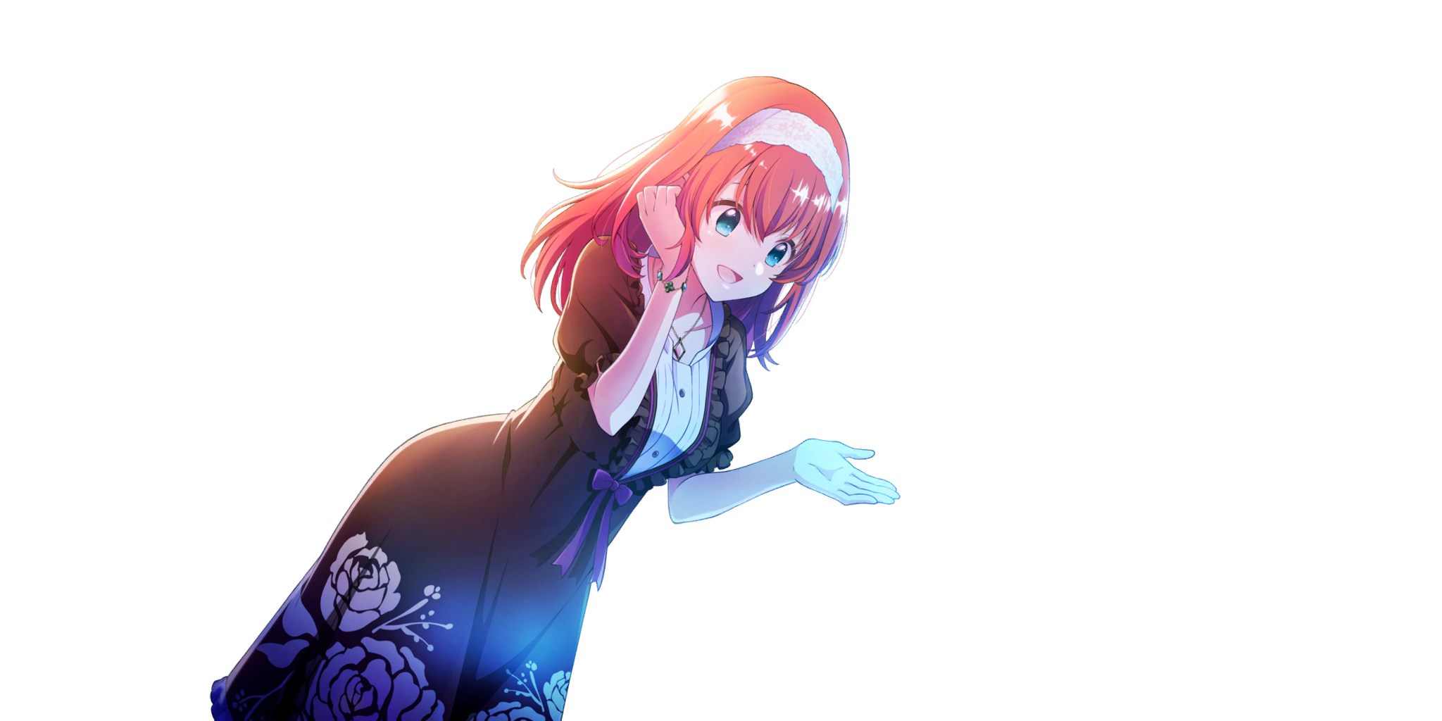 1girl :d black_dress blue_eyes bracelet breasts dot_nose dress dutch_angle floral_print floral_print_dress game_cg gem hairband hand_on_own_cheek hand_on_own_face hands_up highres jewelry lapis_re:lights long_hair medium_breasts necklace open_mouth pink_gem print_dress red_hair rose_print short_sleeves smile solo sparkle third-party_source tiara_(lapis_re:lights) transparent_background white_hairband