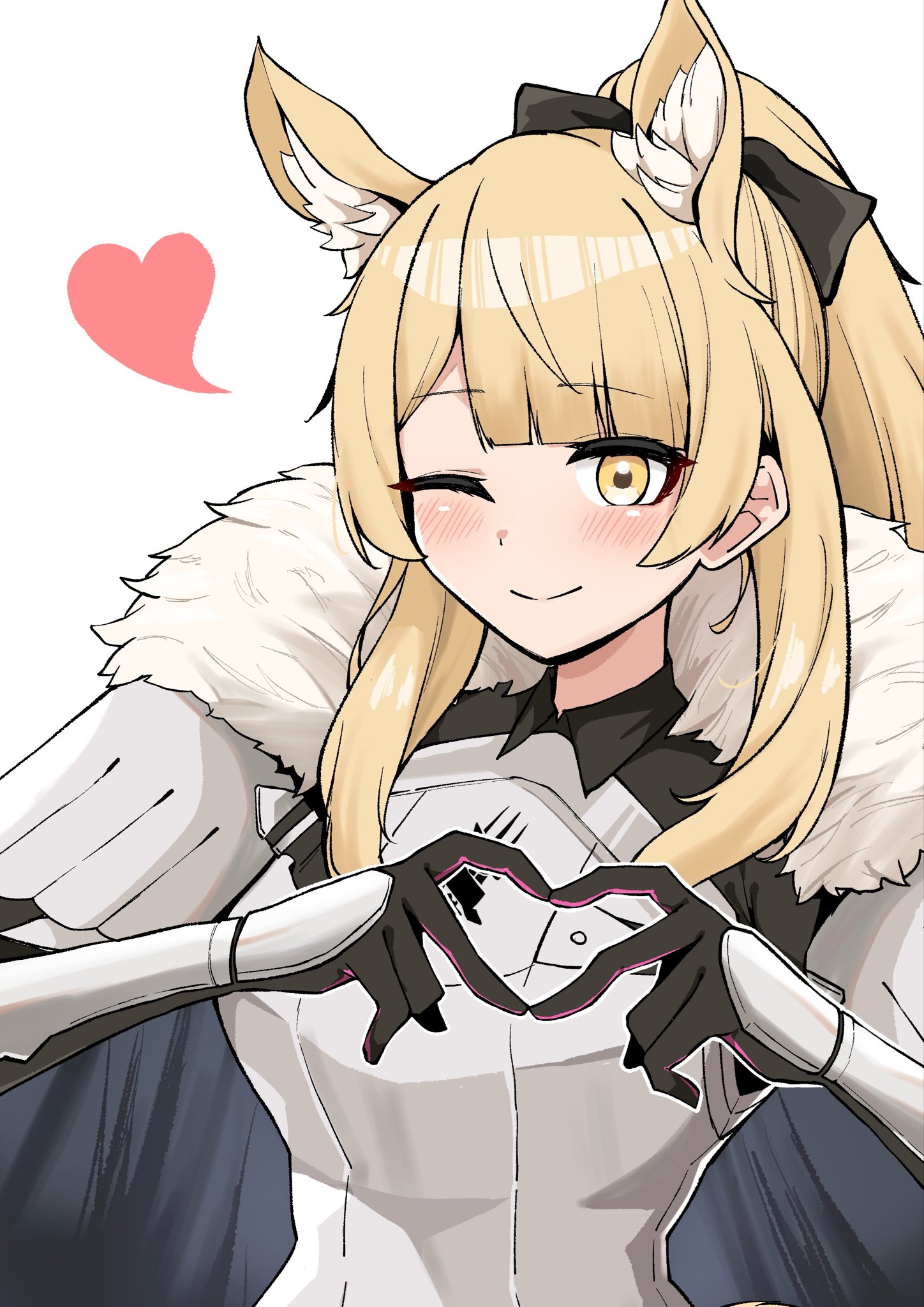 1girl ;) animal_ear_fluff animal_ears arknights armor black_cape black_gloves blemishine_(arknights) blonde_hair blush cape closed_mouth commentary commission english_commentary four-finger_heart_hands fur-trimmed_cape fur_trim gloves heart heart_hands highres kazimierz_logo long_hair looking_at_viewer mikita_casdy mixed-language_commentary one_eye_closed simple_background skeb_commission smile solo split_mouth upper_body vambraces white_background yellow_eyes