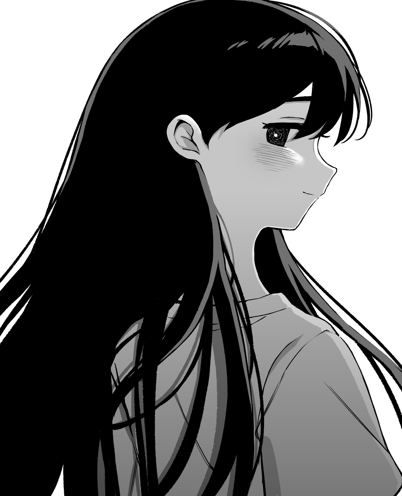 1girl blush bright_pupils closed_mouth commentary_request from_behind greyscale hair_behind_ear hair_between_eyes hato_popo_37 high_contrast highres long_hair looking_at_viewer looking_back mari_(omori) mari_(spirit)_(omori) monochrome omori profile shirt short_sleeves simple_background smile solo spoilers straight_hair upper_body white_background