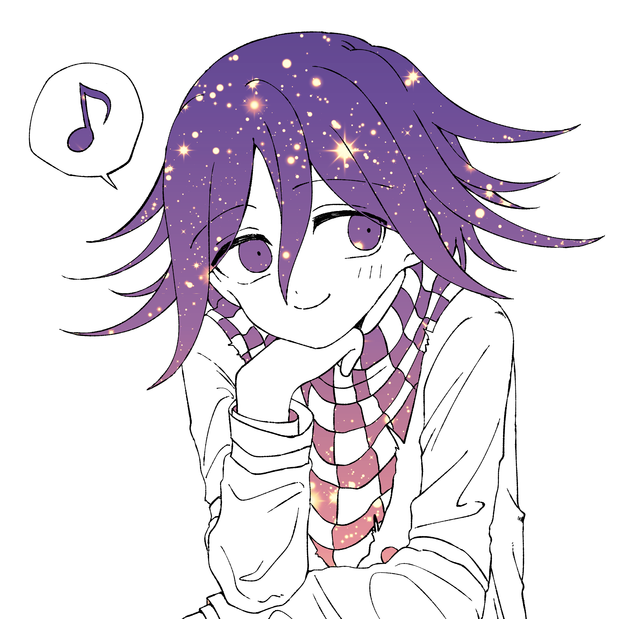 1boy absurdres blush checkered_clothes checkered_scarf commentary_request danganronpa_(series) danganronpa_v3:_killing_harmony flipped_hair hair_between_eyes highres long_sleeves looking_to_the_side male_focus musical_note oma_kokichi purple_eyes purple_hair purple_theme scarf short_hair simple_background sky smile solo spoken_musical_note star_(sky) starry_sky t5mh2 two-tone_scarf upper_body white_background
