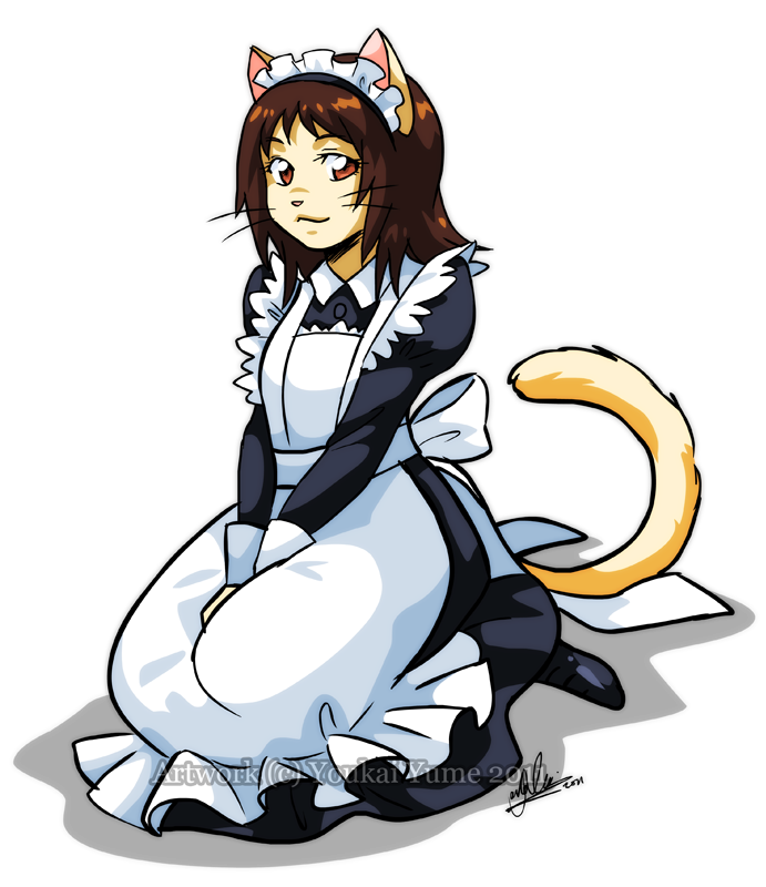 1girl :3 animal_ears animal_nose apron black_dress bow brown_hair cat_ears cat_girl cat_tail dress furry furry_female long_sleeves looking_at_viewer maid maid_headdress neko_no_ongaeshi orange_eyes sandra_chiem short_hair sitting smile solo tail transparent_background watermark whiskers white_apron white_bow yoshioka_haru