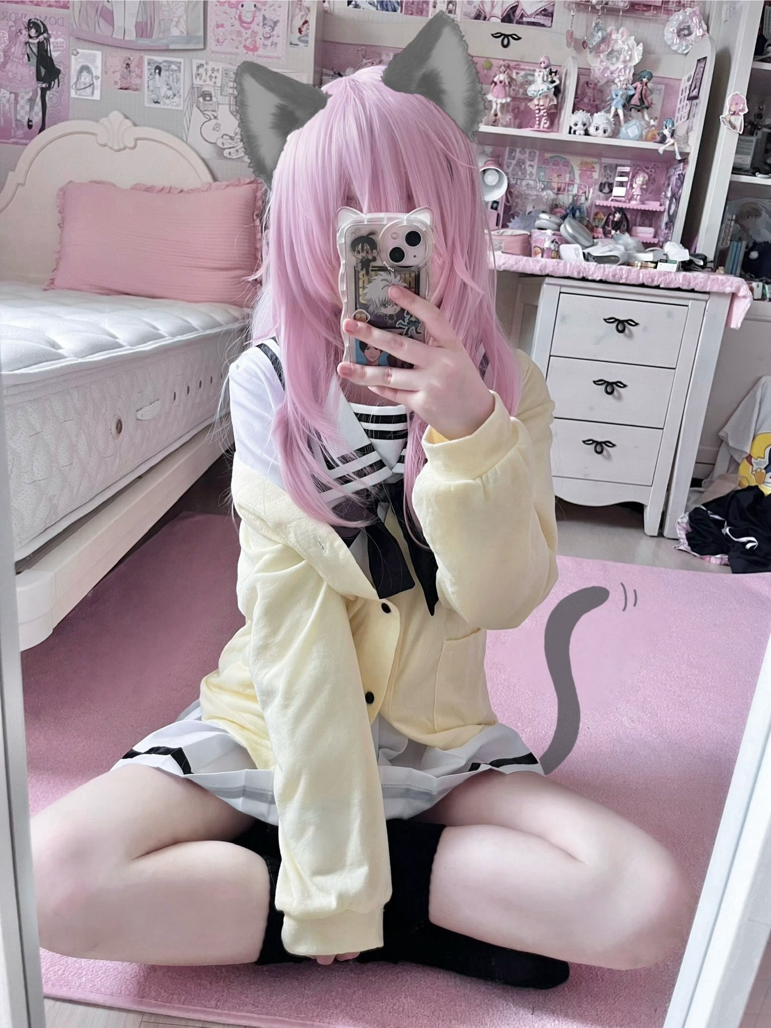 1girl animal_ears bed bedroom black_neckerchief black_skirt black_socks black_tail breasts cardigan cat_ears cat_tail cellphone cosplay cosplay_photo female_focus flat_chest highres holding holding_phone indoors kimi_to_kanojo_to_kanojo_no_koi. legs long_hair long_sleeves miniskirt mukou_aoi_(totono) neckerchief phone photo_(medium) pillow pink_hair pleated_skirt real_life sailor_collar school_uniform serafuku sexually_suggestive shirt_under_sweater sitting skirt sleeves_past_wrists small_breasts smartphone socks solo solo_focus tail thighs white_sailor_collar white_serafuku yellow_cardigan