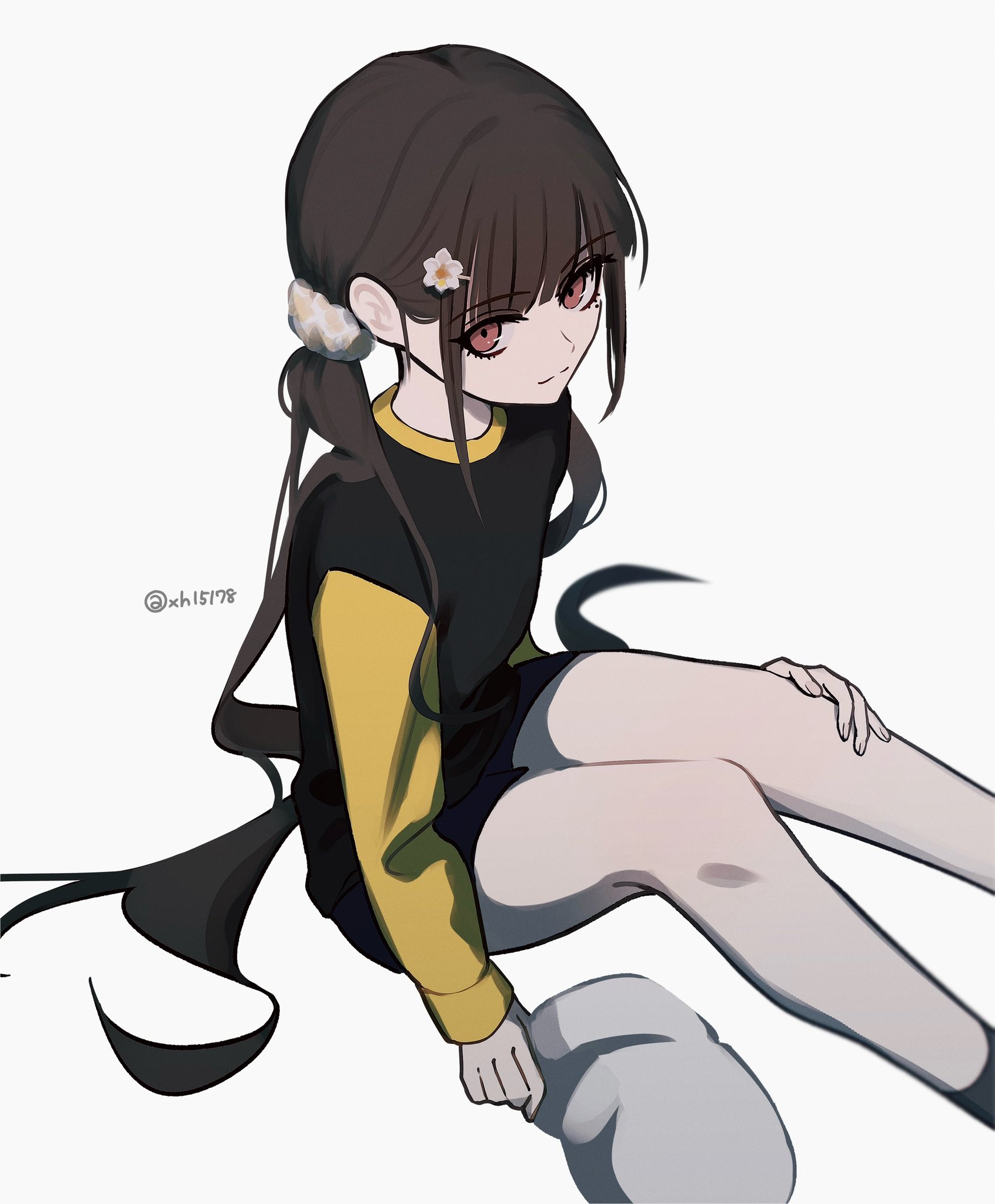 1girl alternate_costume blunt_bangs brown_hair commentary danganronpa_(series) danganronpa_v3:_killing_harmony eyelashes feet_out_of_frame from_above hair_ornament hair_scrunchie hand_on_own_leg harukawa_maki hat highres holding holding_unworn_clothes holding_unworn_hat long_hair long_sleeves looking_at_viewer low_twintails mole mole_under_eye oguma_(ogm) red_eyes scrunchie shirt shorts sitting smile solo twintails twitter_username unworn_hat unworn_headwear very_long_hair white_background