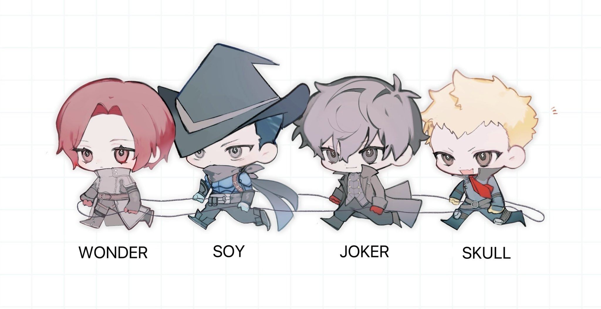 4boys amamiya_ren black_coat black_hair black_pants blonde_hair brown_eyes chibi chibi_only closed_mouth coat commentary_request full_body gloves grid_background hat highres joker_(persona_5) kamin_021 kamishiro_nagisa kanou_shun multiple_boys open_mouth pants persona persona_5 persona_5:_the_phantom_x red_eyes red_gloves red_hair sakamoto_ryuuji short_hair simple_background skull_(persona_5) smile soy_(p5x) walking white_background wonder_(p5x)