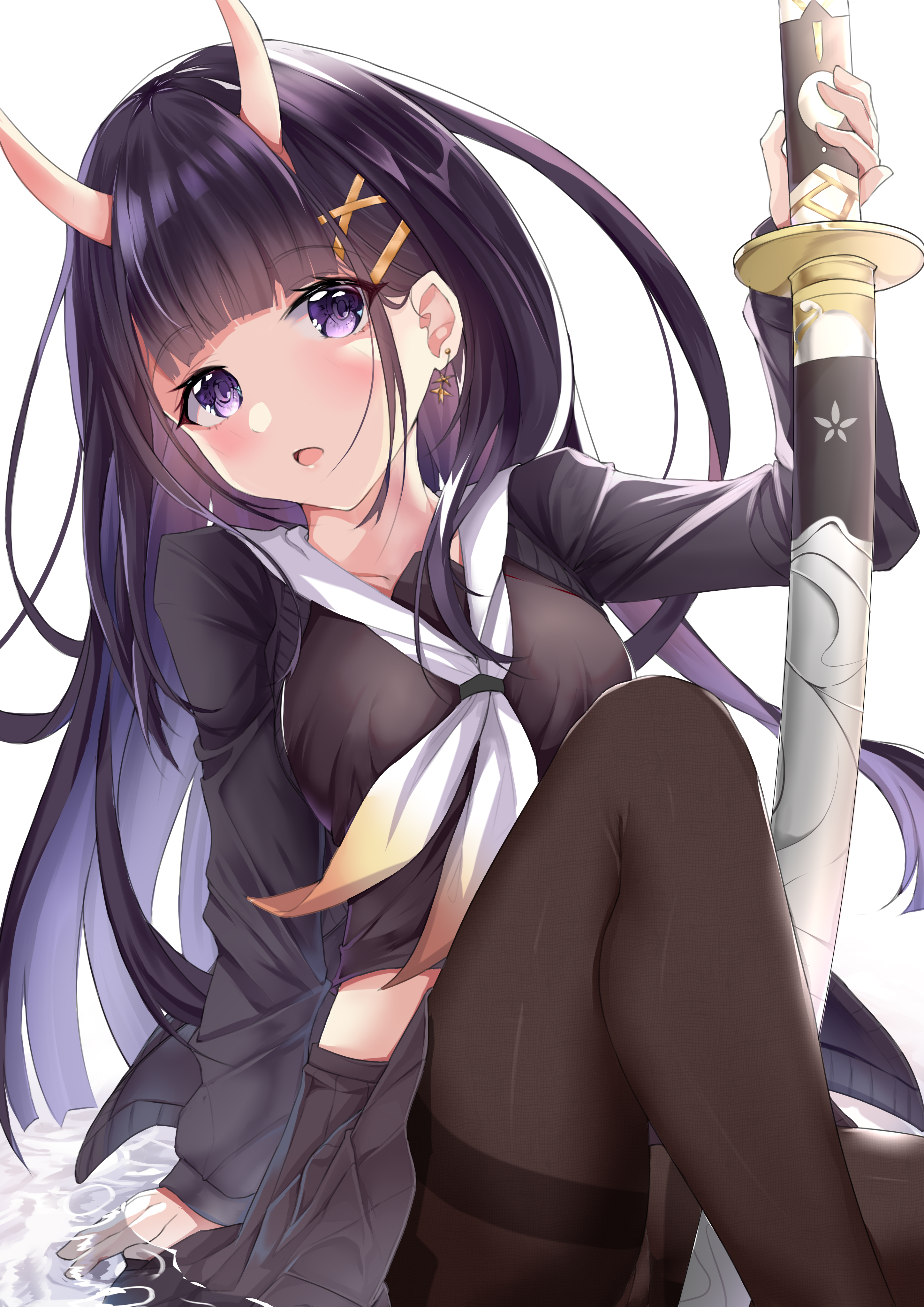 1girl absurdres azur_lane black_cardigan black_hair black_serafuku black_skirt breasts brown_pantyhose cardigan commentary_request ct.ender earrings feet_out_of_frame hair_ornament hairclip highres holding holding_sword holding_weapon horns jewelry long_hair long_sleeves looking_at_viewer medium_breasts midriff_peek miniskirt neckerchief noshiro_(azur_lane) oni pantyhose pleated_skirt purple_eyes sailor_collar scabbard school_uniform serafuku sheath sheathed simple_background sitting skin-covered_horns skirt solo sword thighband_pantyhose water weapon white_background white_neckerchief white_sailor_collar x_hair_ornament