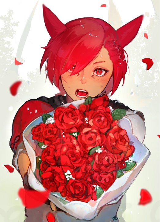 1boy animal_ears aomushi_komushi bouquet cat_ears facial_mark falling_petals final_fantasy final_fantasy_xiv flower g'raha_tia hair_ornament holding holding_bouquet incoming_gift leaf looking_at_viewer male_focus miqo'te open_mouth petals red_eyes red_flower red_hair red_rose rose short_hair solo sweat swept_bangs upper_body x_hair_ornament