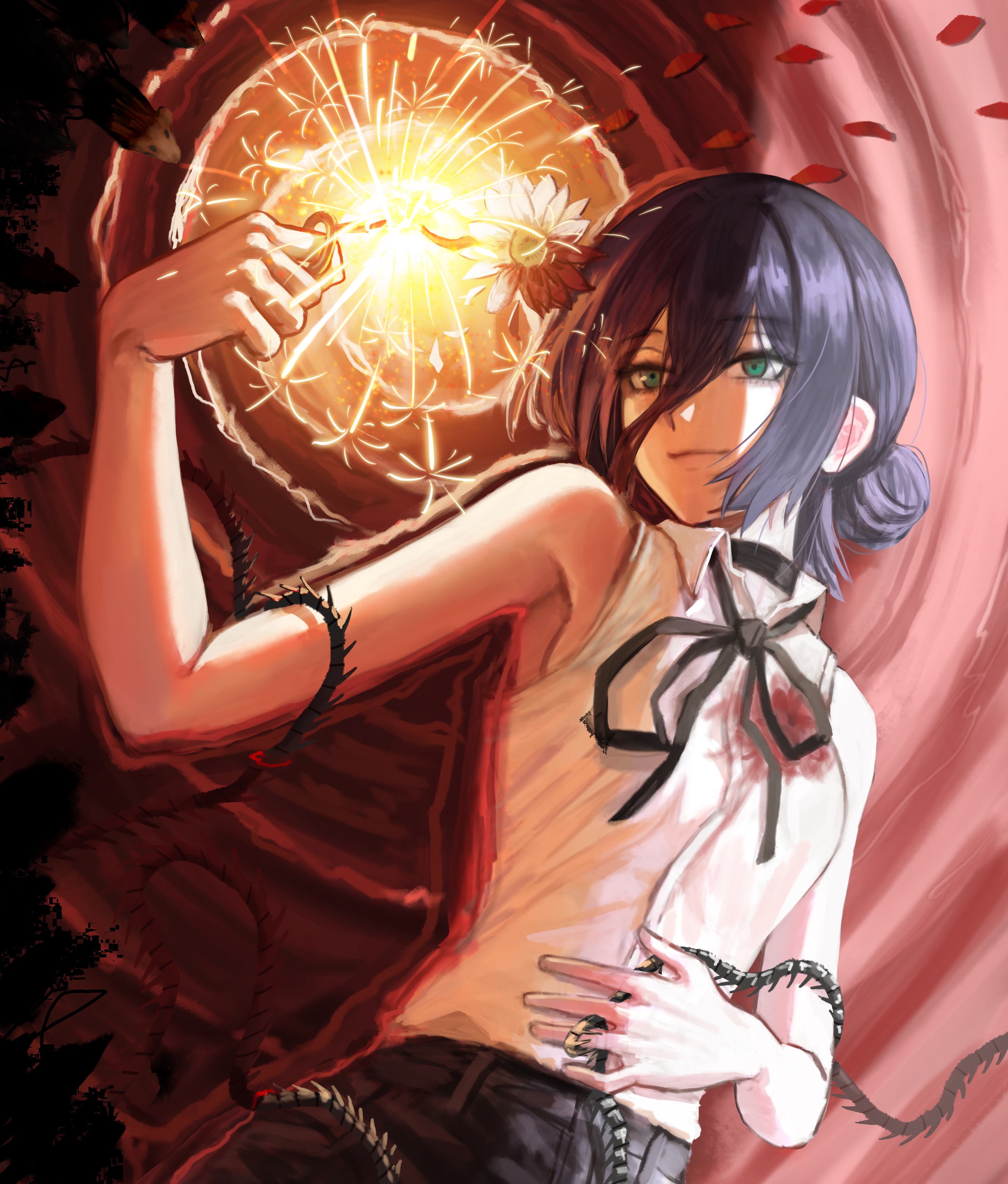 1girl absurdres black_choker black_hair black_ribbon blood blood_on_clothes chainsaw_man choker failose flower green_eyes grenade_pin hair_between_eyes hair_bun highres injury lying neck_ribbon on_back reze_(chainsaw_man) ribbon shirt shirt_tucked_in sleeveless sleeveless_shirt solo sparks white_flower white_shirt