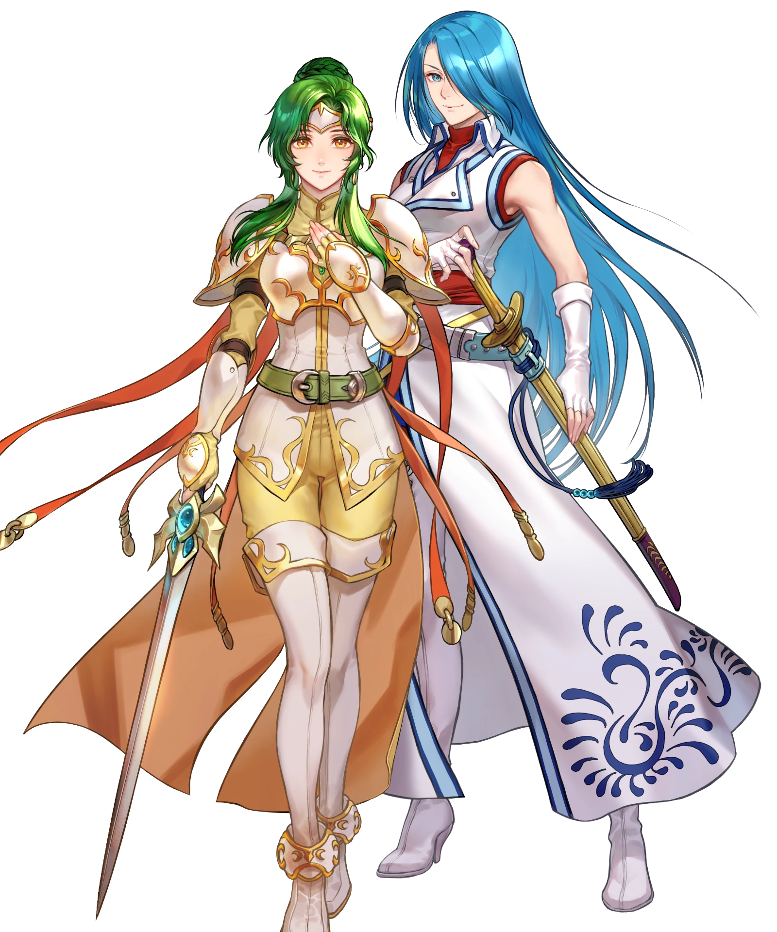2girls armor bare_shoulders blue_eyes blue_hair breastplate elincia_ridell_crimea facing_viewer fire_emblem fire_emblem:_path_of_radiance fire_emblem_heroes gloves gold_cape green_hair hair_bun hair_over_one_eye hand_on_own_chest high_heels highres holding holding_sword holding_weapon long_hair looking_at_viewer lucia_(fire_emblem) multiple_girls nintendo non-web_source official_art shoulder_armor smile sword tachi-e very_long_hair weapon white_gloves