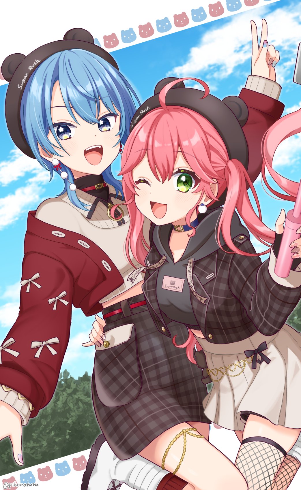 2girls ahoge blue_eyes blue_hair fishnet_thighhighs fishnets green_eyes highres hololive hoshimachi_suisei hoshimachi_suisei_(micomet) looking_at_viewer multiple_girls official_alternate_costume one_eye_closed open_mouth pina710 pink_hair sakura_miko sakura_miko_(micomet) smile star_(symbol) star_in_eye symbol_in_eye teeth thighhighs upper_teeth_only v virtual_youtuber
