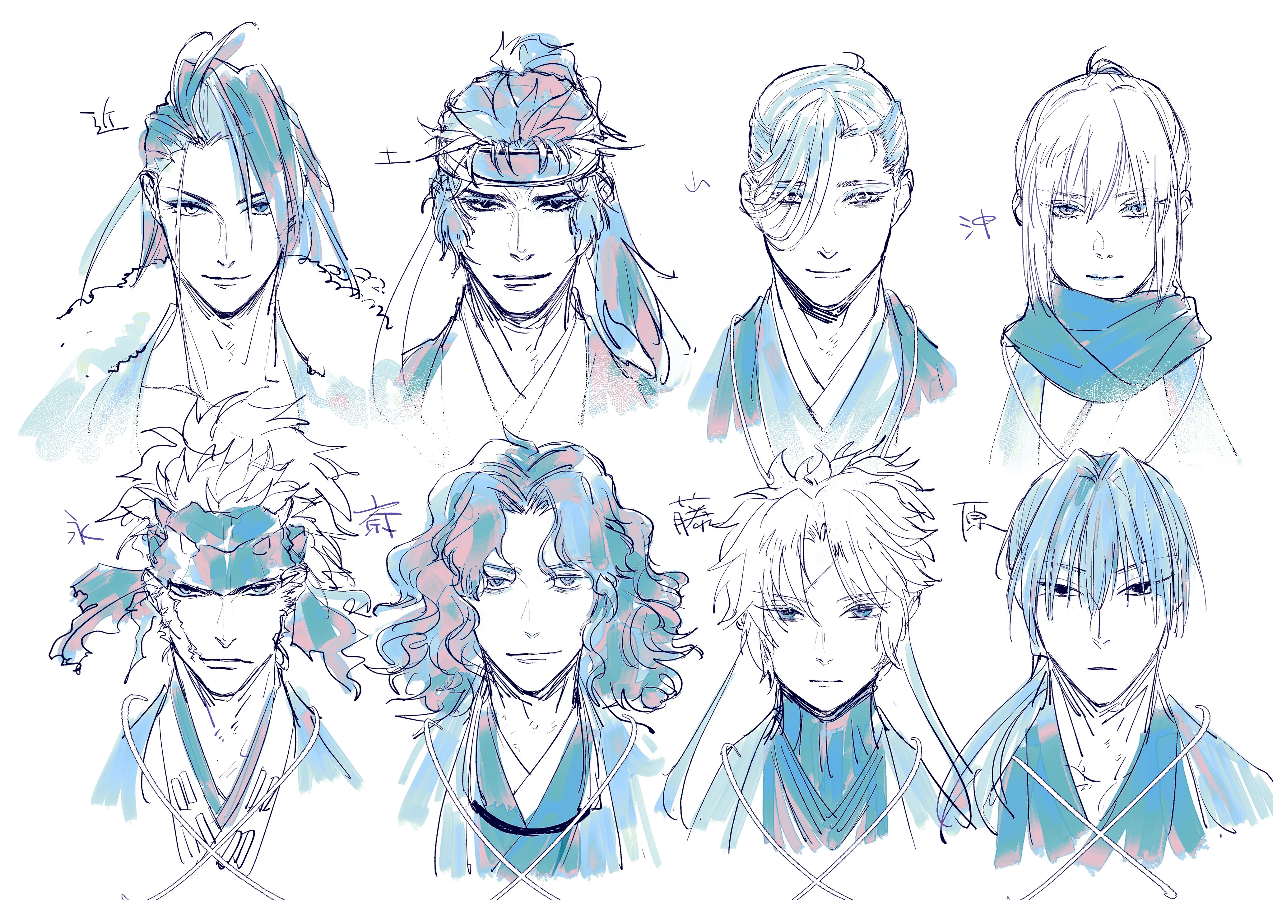 1girl 6+boys absurdres antenna_hair cropped_torso curtained_hair facial_scar fate/grand_order fate_(series) harada_sanosuke_(fate) headband heterochromia highres hijikata_toshizou_(fate) kondou_isami_(fate) long_hair looking_at_viewer medium_hair multiple_boys nagakura_shinpachi_(fate) okita_souji_(fate) okita_souji_(koha-ace) okita_souji_(teal_haori_and_hakama)_(fate) ponytail saitou_hajime_(fate) sayo_(38b_c0) scar scar_on_cheek scar_on_face scar_on_forehead scarf shinsengumi_(fate) simple_background smile toudou_heisuke_(fate) white_background yamanami_keisuke_(fate)